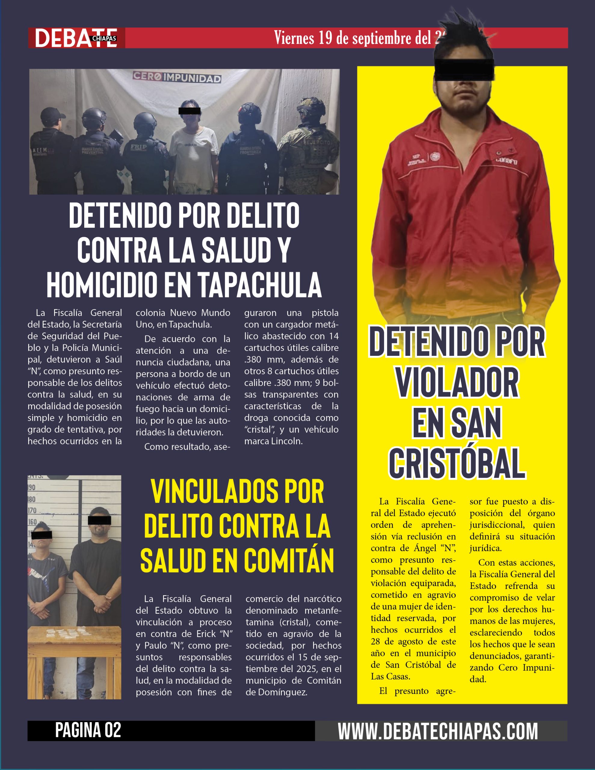 La Fiscalía General del Estado, la Secretaría de Seguridad del Pueblo y la Policía Municipal, detuvieron a Saúl “N”, como presunto responsable de los delitos contra la salud, en su modalidad de posesión simple y homicidio en grado de tentativa, por hechos ocurridos en la colonia Nuevo Mundo Uno, en Tapachula.