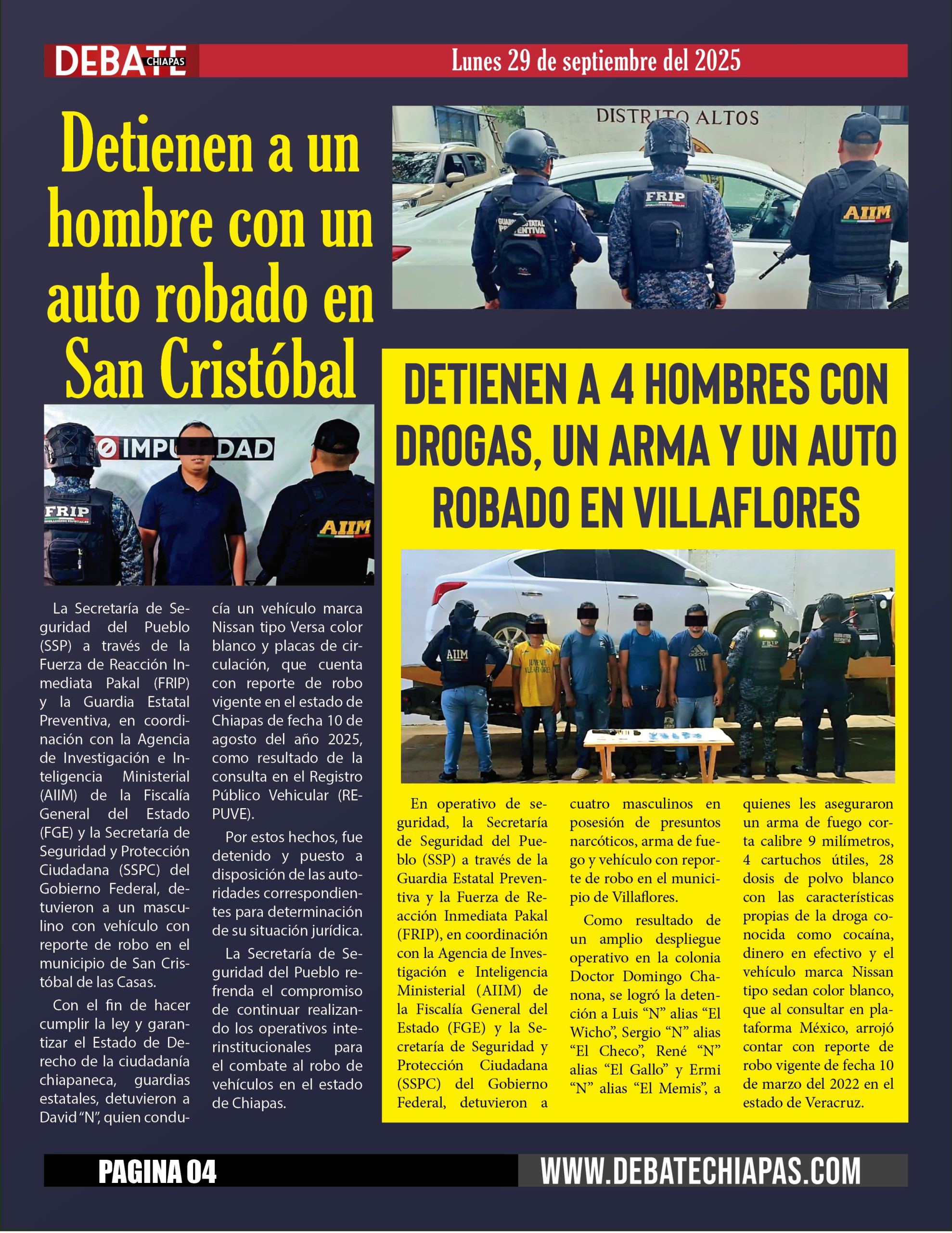 La Secretaría de Seguridad del Pueblo (SSP) a través de la Fuerza de Reacción Inmediata Pakal (FRIP) y la Guardia Estatal Preventiva, en coordinación con la Agencia de Investigación e Inteligencia Ministerial (AIIM) de la Fiscalía General del Estado (FGE) y la Secretaría de Seguridad y Protección Ciudadana (SSPC) del Gobierno Federal, detuvieron a un masculino con vehículo con reporte de robo en el municipio de San Cristóbal de las Casas.