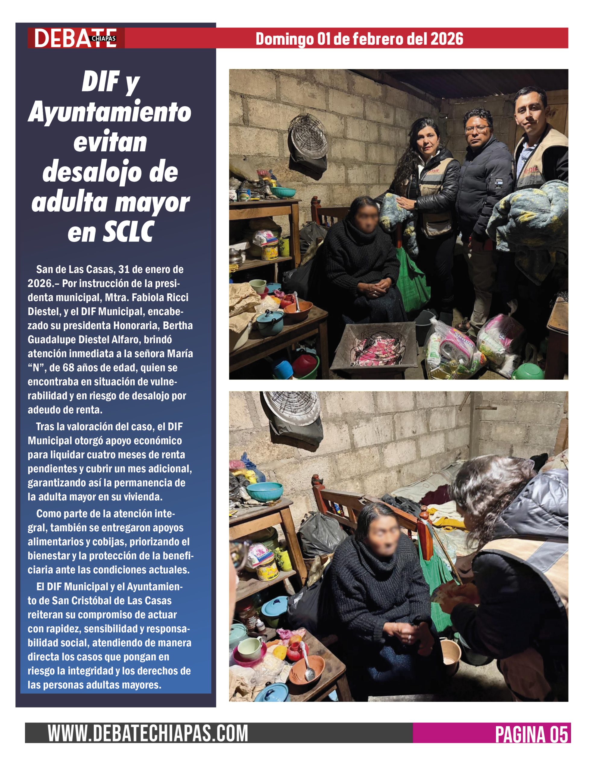 San de Las Casas, 31 de enero de 2026.– Por instrucción de la presidenta municipal, Mtra. Fabiola Ricci Diestel, y el DIF Municipal, encabezado su presidenta Honoraria, Bertha Guadalupe Diestel Alfaro, brindó atención inmediata a la señora María “N”, de 68 años de edad, quien se encontraba en situación de vulnerabilidad y en riesgo de desalojo por adeudo de renta.