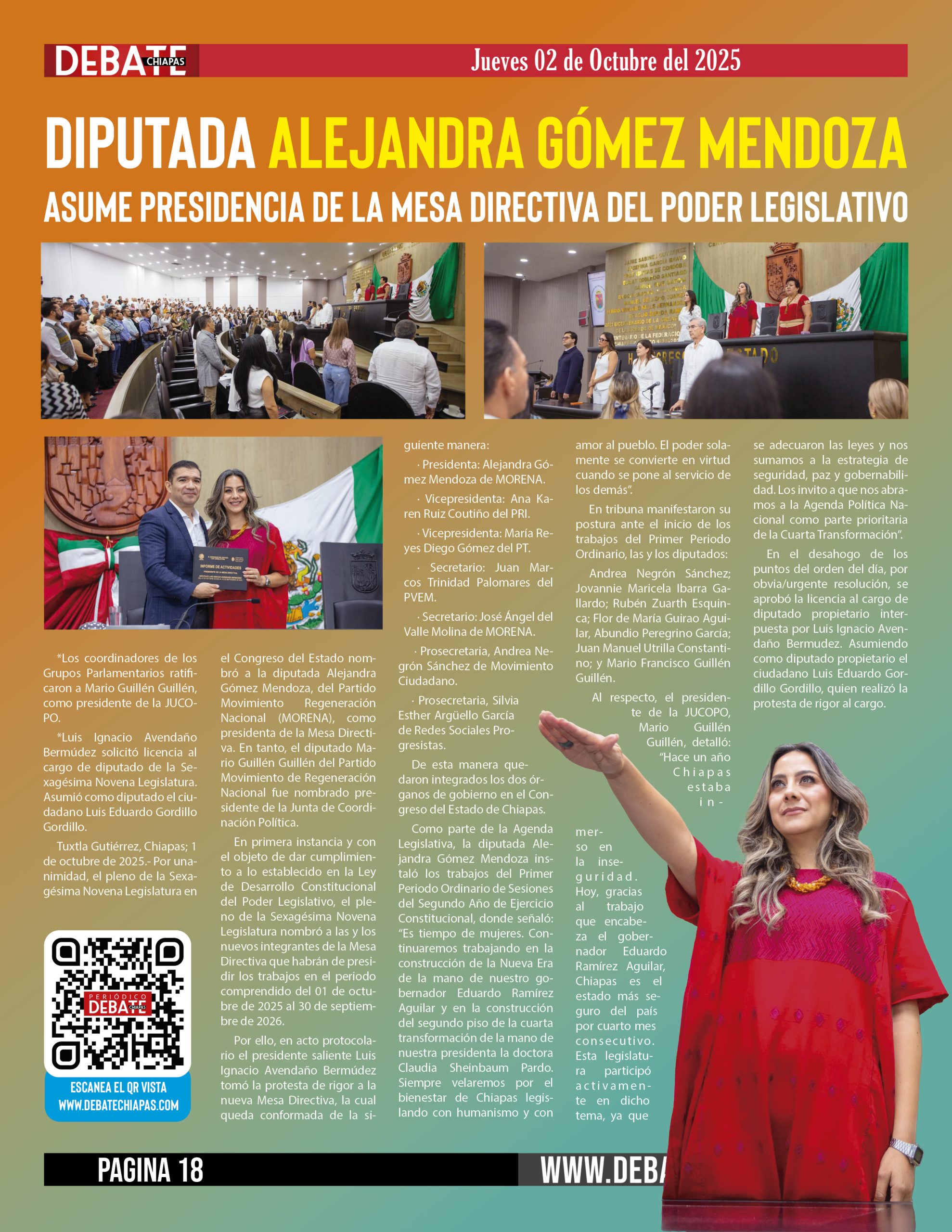 Tuxtla Gutiérrez, Chiapas; 1 de octubre de 2025.- Por unanimidad, el pleno de la Sexagésima Novena Legislatura en el Congreso del Estado nombró a la diputada Alejandra Gómez Mendoza, del Partido Movimiento Regeneración Nacional (MORENA), como presidenta de la Mesa Directiva. En tanto, el diputado Mario Guillén Guillén del Partido Movimiento de Regeneración Nacional fue nombrado presidente de la Junta de Coordinación Política.