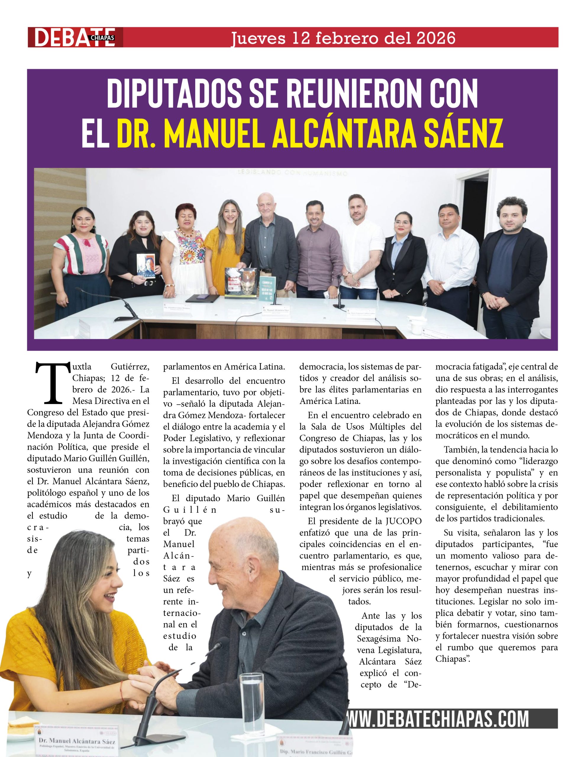 Tuxtla Gutiérrez, Chiapas; 12 de febrero de 2026.- La Mesa Directiva en el Congreso del Estado que preside la diputada Alejandra Gómez Mendoza y la Junta de Coordinación Política, que preside el diputado Mario Guillén Guillén, sostuvieron una reunión con el Dr. Manuel Alcántara Sáenz, politólogo español y uno de los académicos más destacados en el estudio de la democracia, los sistemas de partidos y los parlamentos en América Latina.