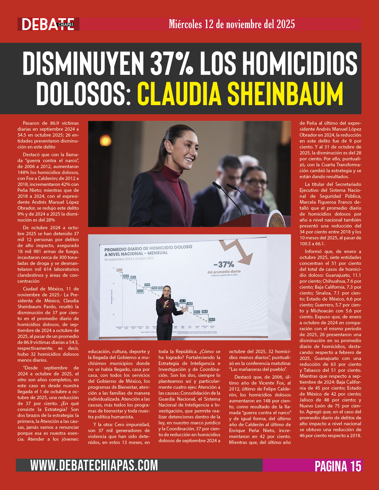 Ciudad de México, 11 de noviembre de 2025.- La Presidenta de México, Claudia Sheinbaum Pardo, resaltó la disminución de 37 por ciento en el promedio diario de homicidios dolosos, de septiembre de 2024 a octubre de 2025, al pasar de un promedio de 86.9 víctimas diarias a 54.5, respectivamente, es decir, hubo 32 homicidios dolosos menos diarios.