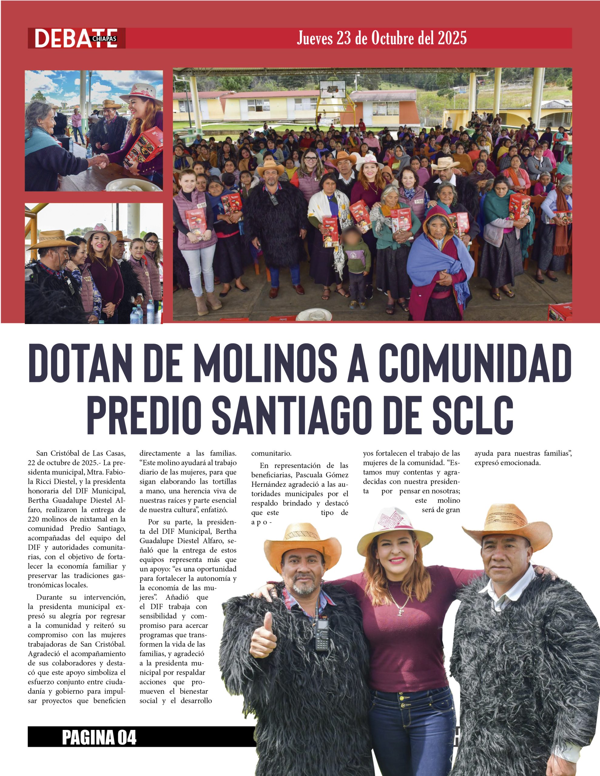 San Cristóbal de Las Casas, 22 de octubre de 2025.- La presidenta municipal, Mtra. Fabiola Ricci Diestel, y la presidenta honoraria del DIF Municipal, Bertha Guadalupe Diestel Alfaro, realizaron la entrega de 220 molinos de nixtamal en la comunidad Predio Santiago, acompañadas del equipo del DIF y autoridades comunitarias, con el objetivo de fortalecer la economía familiar y preservar las tradiciones gastronómicas locales.