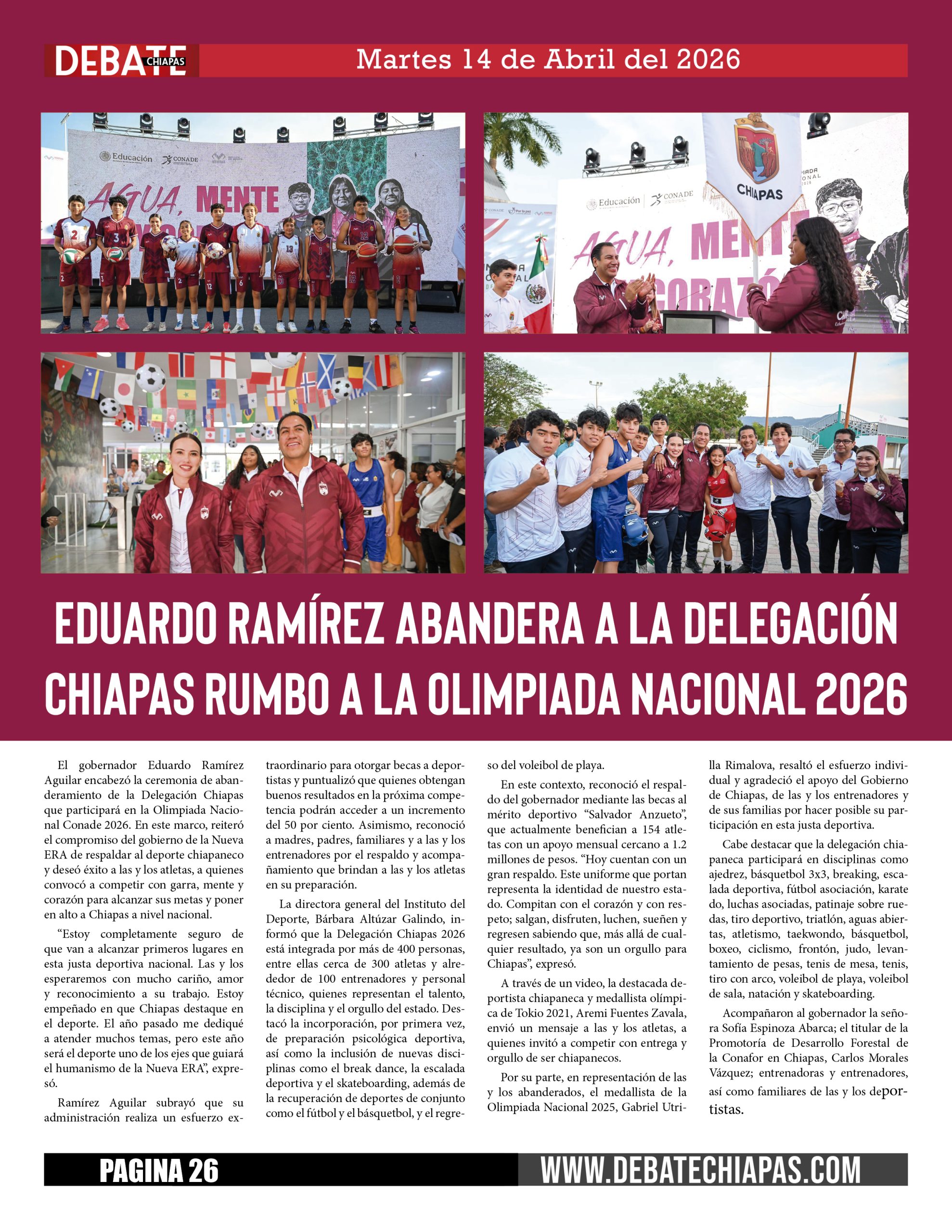 En este contexto, reconoció el respaldo del gobernador mediante las becas al mérito deportivo “Salvador Anzueto”, que actualmente benefician a 154 atletas con un apoyo mensual cercano a 1.2 millones de pesos. “Hoy cuentan con un gran respaldo. Este uniforme que portan representa la identidad de nuestro estado. Compitan con el corazón y con respeto; salgan, disfruten, luchen, sueñen y regresen sabiendo que, más allá de cualquier resultado, ya son un orgullo para Chiapas”, expresó.