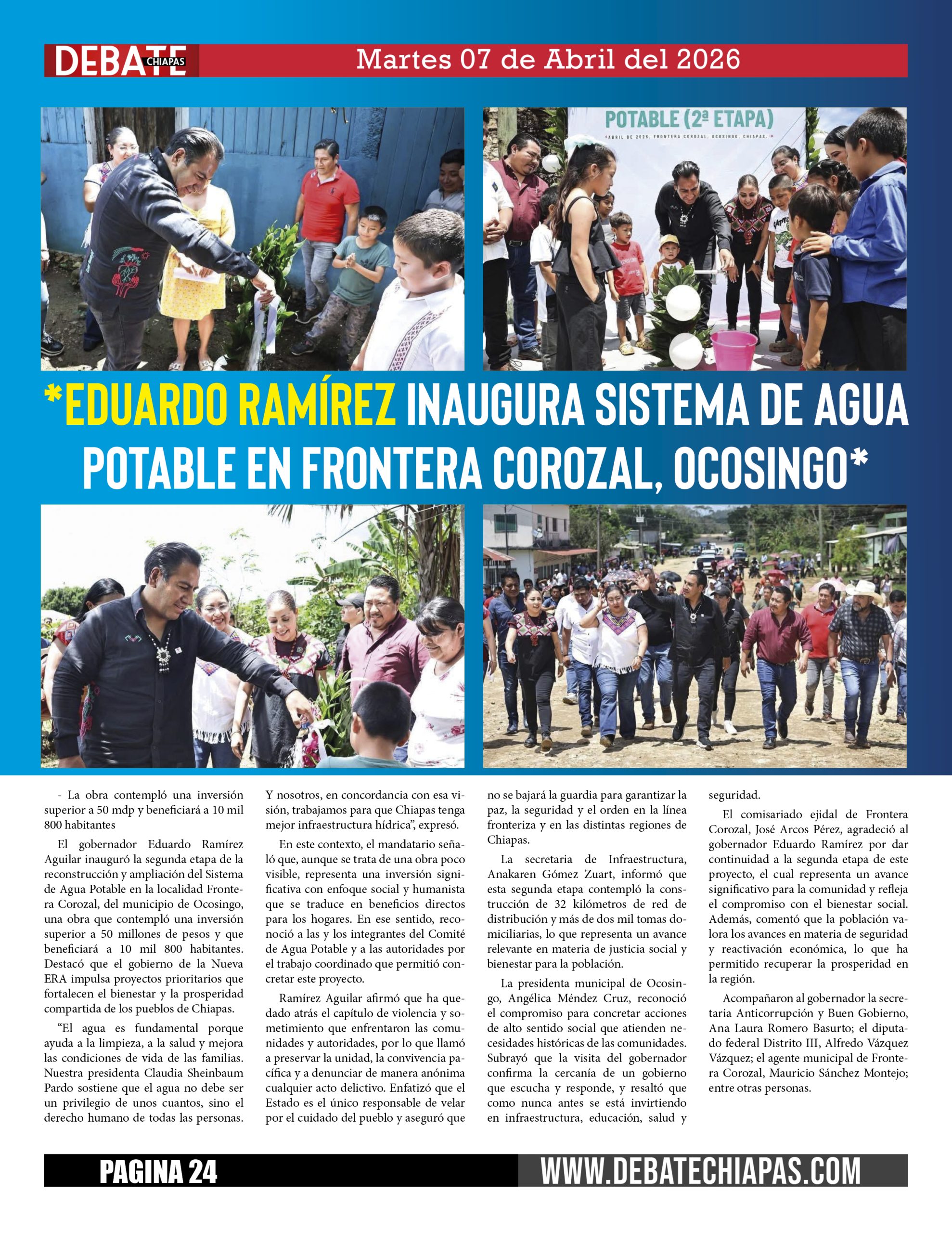 El gobernador Eduardo Ramírez Aguilar inauguró la segunda etapa de la reconstrucción y ampliación del Sistema de Agua Potable en la localidad Frontera Corozal, del municipio de Ocosingo, una obra que contempló una inversión superior a 50 millones de pesos y que beneficiará a 10 mil 800 habitantes. Destacó que el gobierno de la Nueva ERA impulsa proyectos prioritarios que fortalecen el bienestar y la prosperidad compartida de los pueblos de Chiapas.
