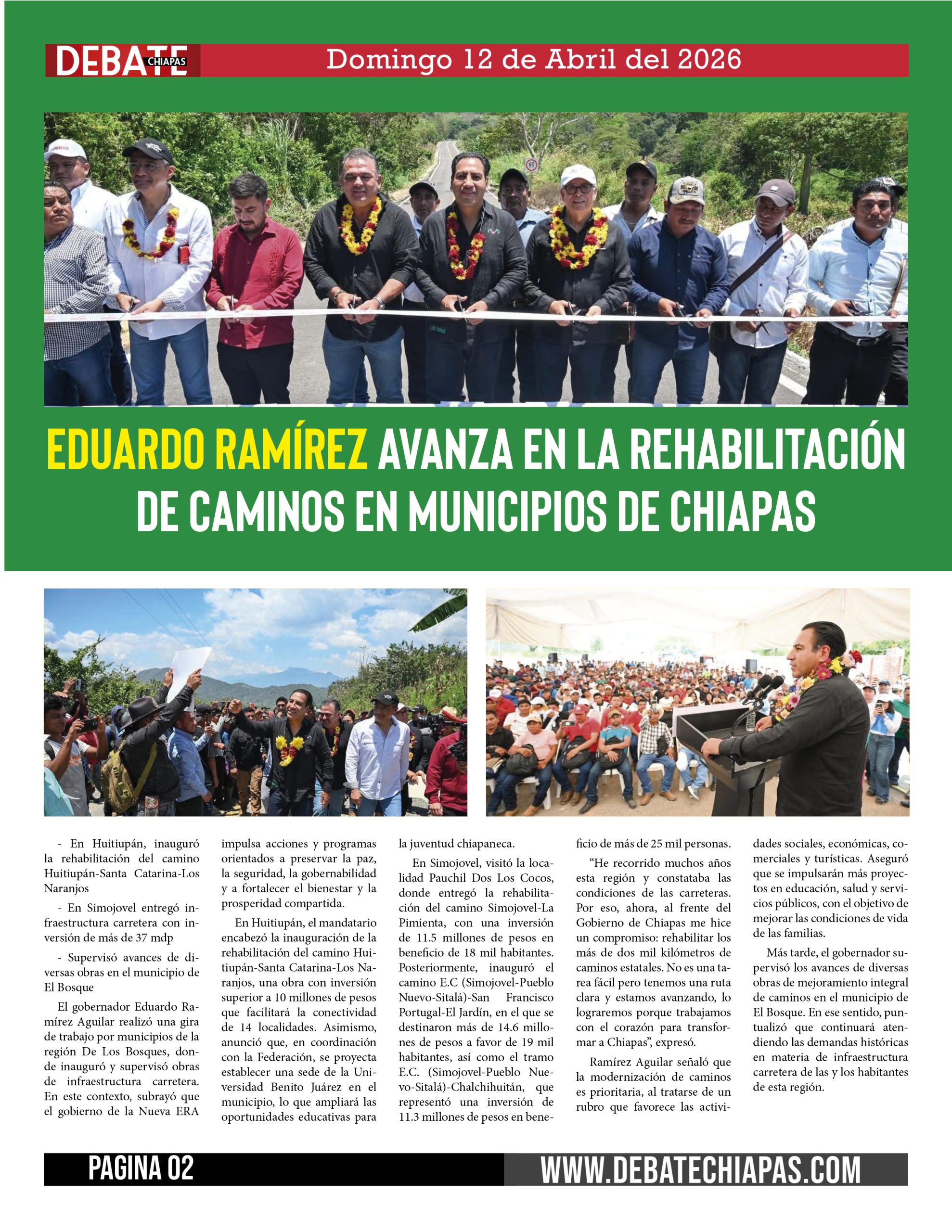 En Huitiupán, el mandatario encabezó la inauguración de la rehabilitación del camino Huitiupán-Santa Catarina-Los Naranjos, una obra con inversión superior a 10 millones de pesos que facilitará la conectividad de 14 localidades. Asimismo, anunció que, en coordinación con la Federación, se proyecta establecer una sede de la Universidad Benito Juárez en el municipio, lo que ampliará las oportunidades educativas para la juventud chiapaneca.