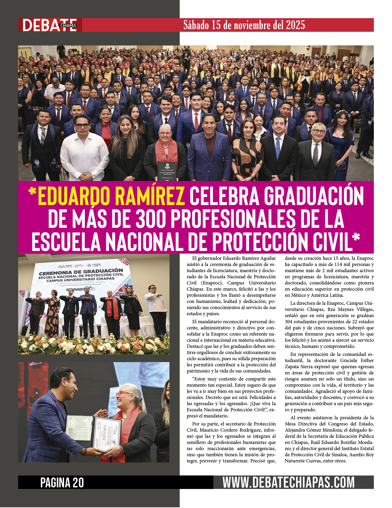 El gobernador Eduardo Ramírez Aguilar asistió a la ceremonia de graduación de estudiantes de licenciatura, maestría y doctorado de la Escuela Nacional de Protección Civil (Enaproc), Campus Universitario Chiapas. En este marco, felicitó a las y los profesionistas y los llamó a desempeñarse con humanismo, lealtad y dedicación, poniendo sus conocimientos al servicio de sus estados y países.
