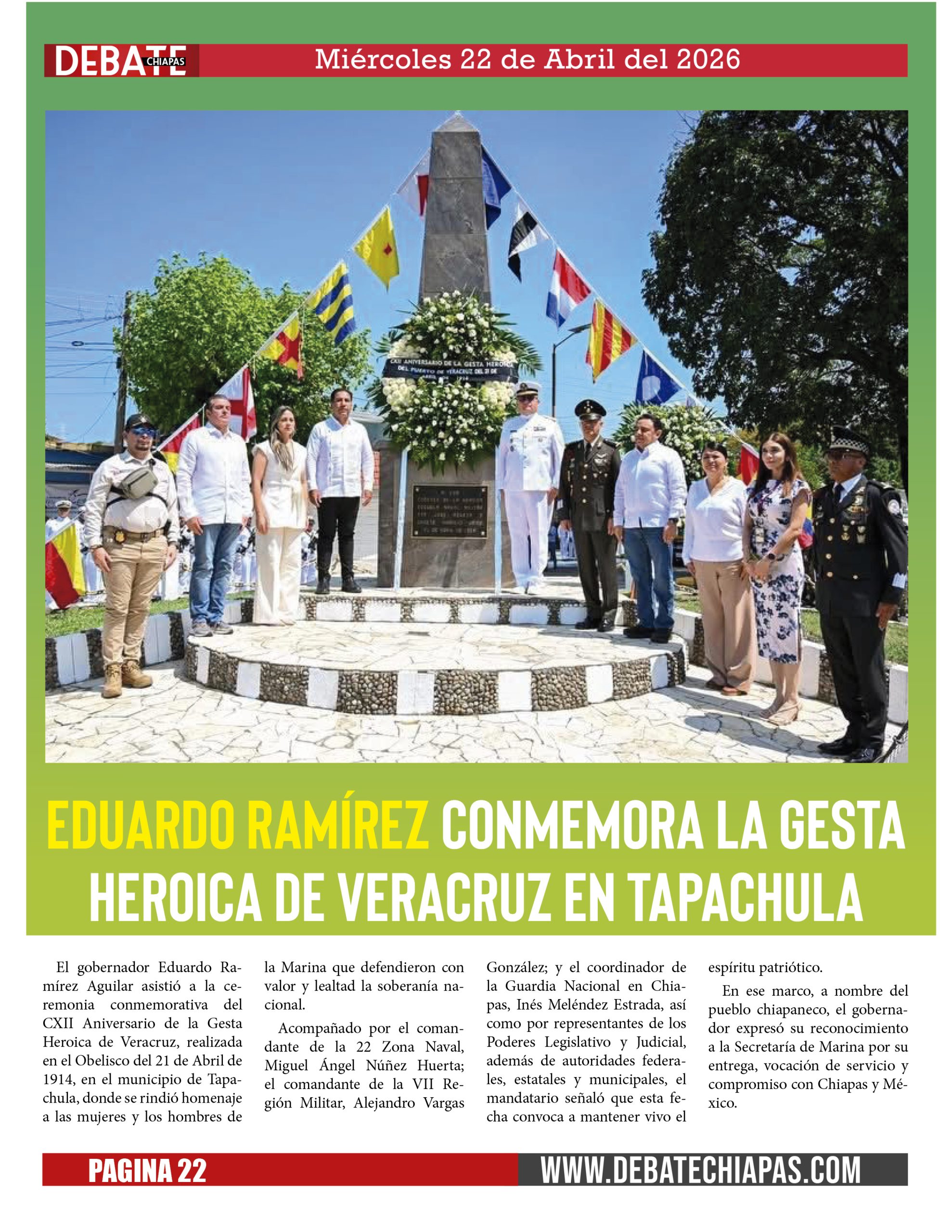 El gobernador Eduardo Ramírez Aguilar asistió a la ceremonia conmemorativa del CXII Aniversario de la Gesta Heroica de Veracruz, realizada en el Obelisco del 21 de Abril de 1914, en el municipio de Tapachula, donde se rindió homenaje a las mujeres y los hombres de la Marina que defendieron con valor y lealtad la soberanía nacional.