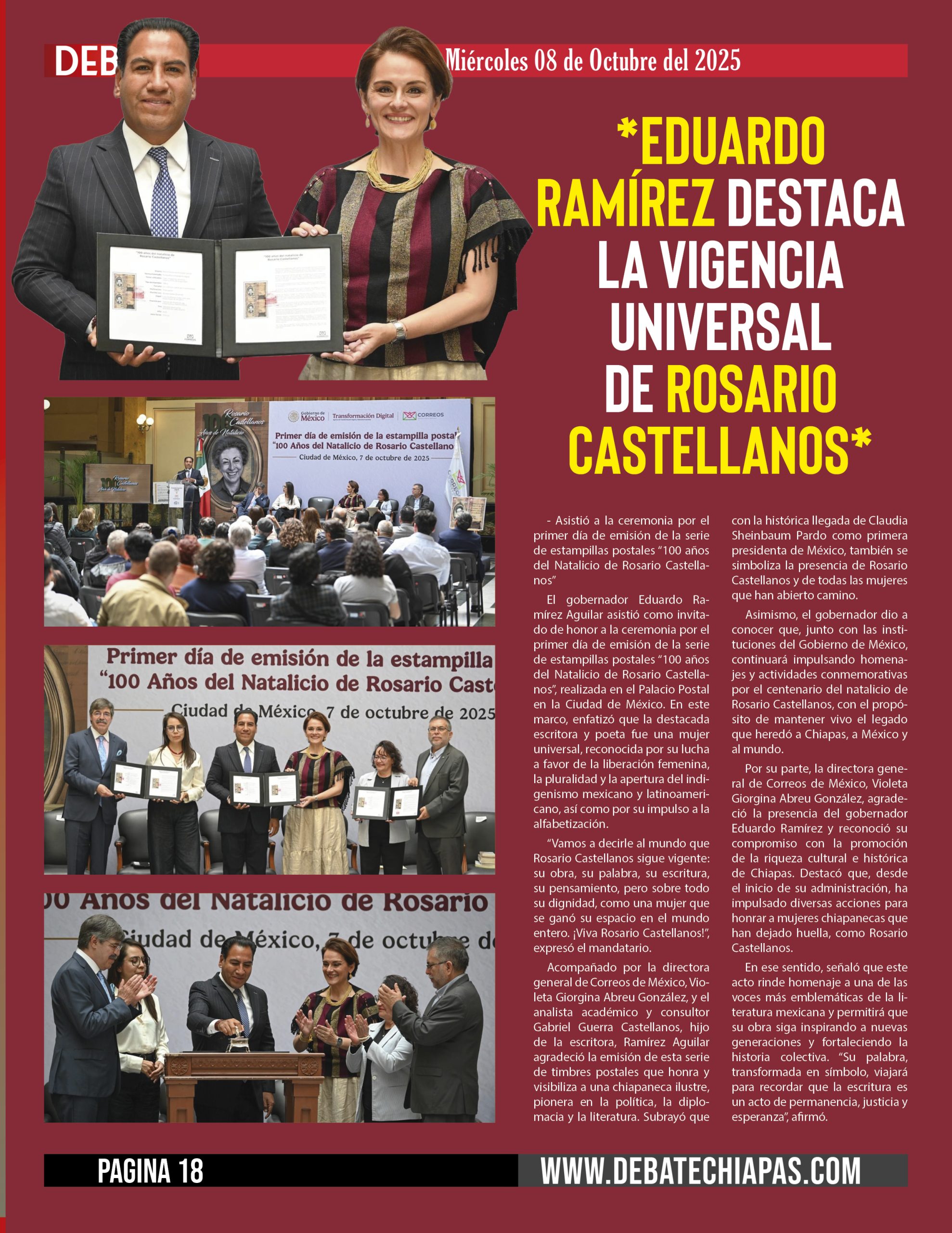El gobernador Eduardo Ramírez Aguilar asistió como invitado de honor a la ceremonia por el primer día de emisión de la serie de estampillas postales “100 años del Natalicio de Rosario Castellanos”, realizada en el Palacio Postal en la Ciudad de México. En este marco, enfatizó que la destacada escritora y poeta fue una mujer universal, reconocida por su lucha a favor de la liberación femenina, la pluralidad y la apertura del indigenismo mexicano y latinoamericano, así como por su impulso a la alfabetización.