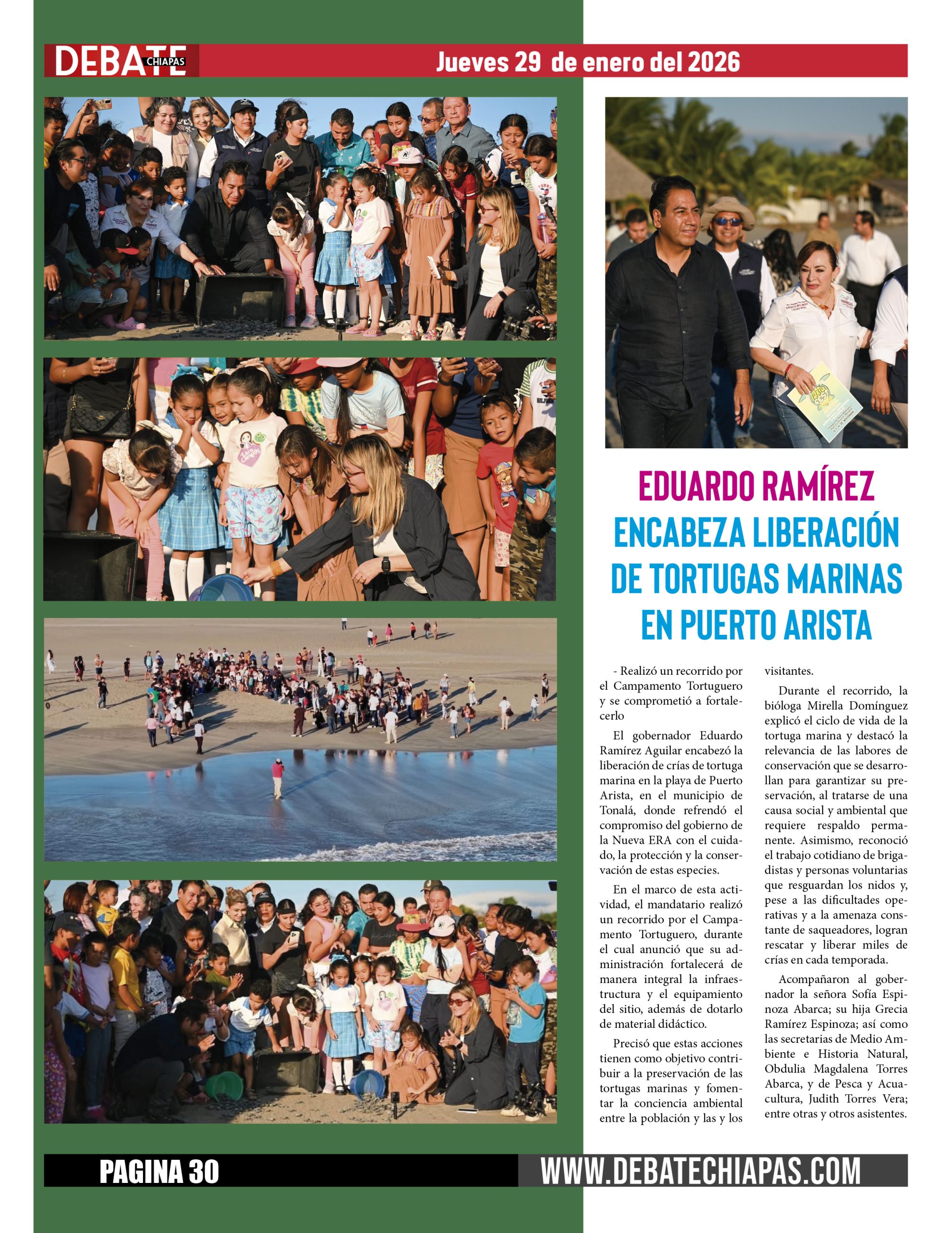 El gobernador Eduardo Ramírez Aguilar encabezó la liberación de crías de tortuga marina en la playa de Puerto Arista, en el municipio de Tonalá, donde refrendó el compromiso del gobierno de la Nueva ERA con el cuidado, la protección y la conservación de estas especies.