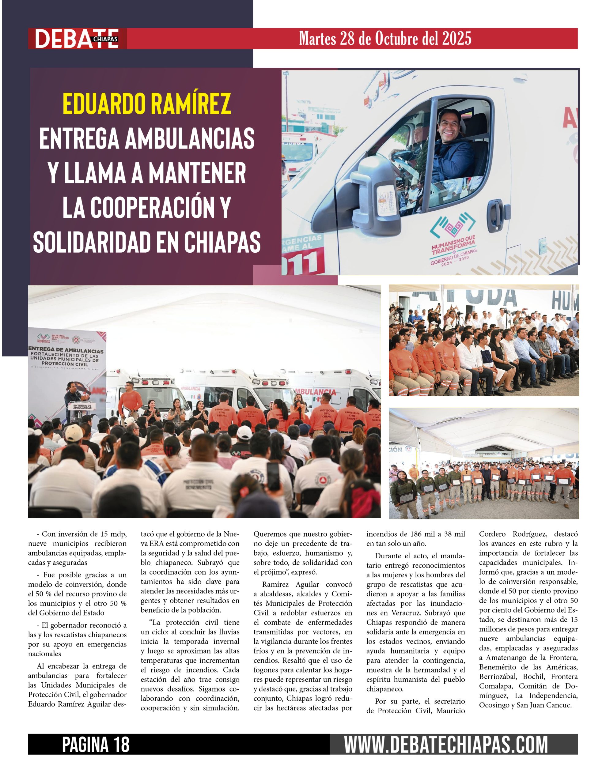 Al encabezar la entrega de ambulancias para fortalecer las Unidades Municipales de Protección Civil, el gobernador Eduardo Ramírez Aguilar destacó que el gobierno de la Nueva ERA está comprometido con la seguridad y la salud del pueblo chiapaneco. Subrayó que la coordinación con los ayuntamientos ha sido clave para atender las necesidades más urgentes y obtener resultados en beneficio de la población.