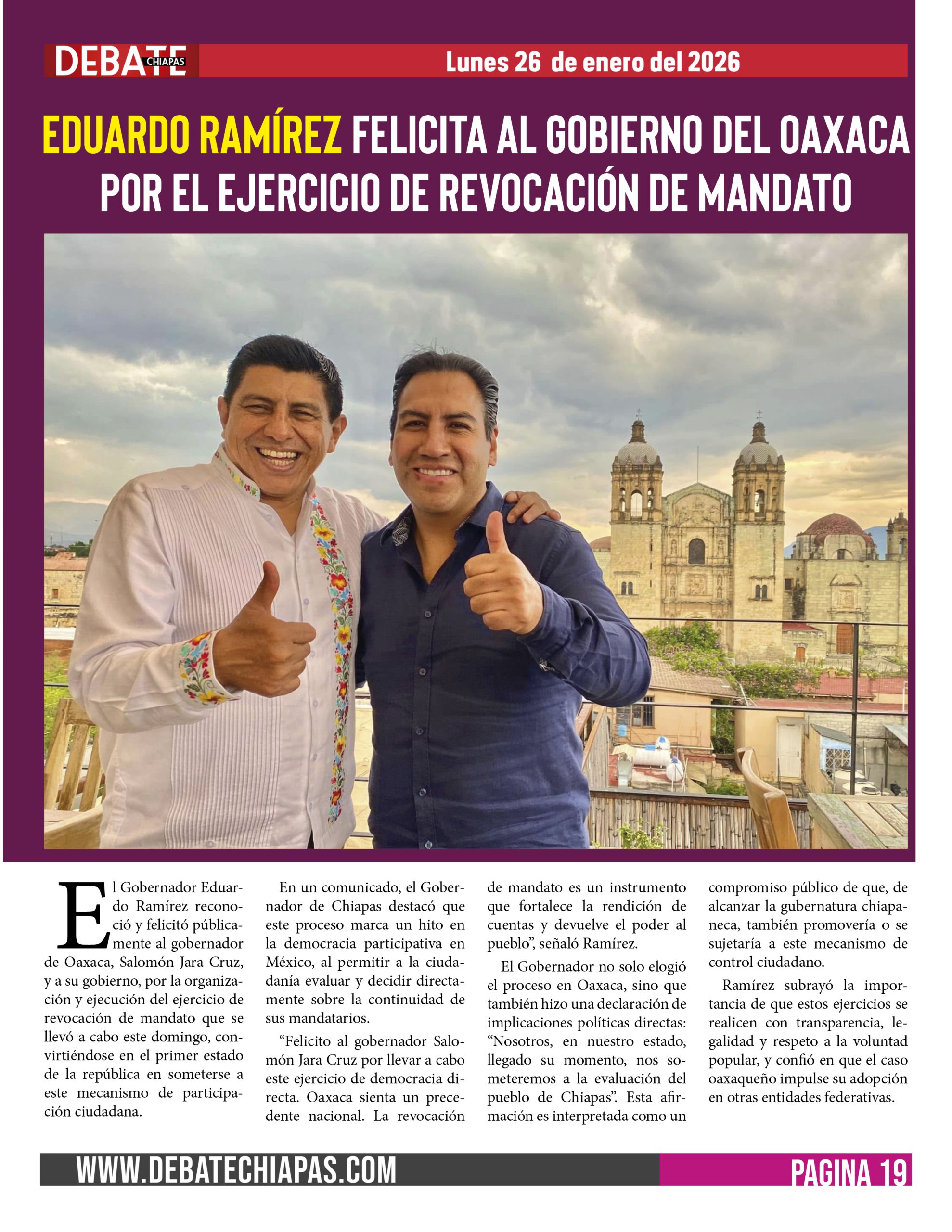 «Felicito al gobernador Salomón Jara Cruz por llevar a cabo este ejercicio de democracia directa. Oaxaca sienta un precedente nacional. La revocación de mandato es un instrumento que fortalece la rendición de cuentas y devuelve el poder al pueblo», señaló Ramírez.