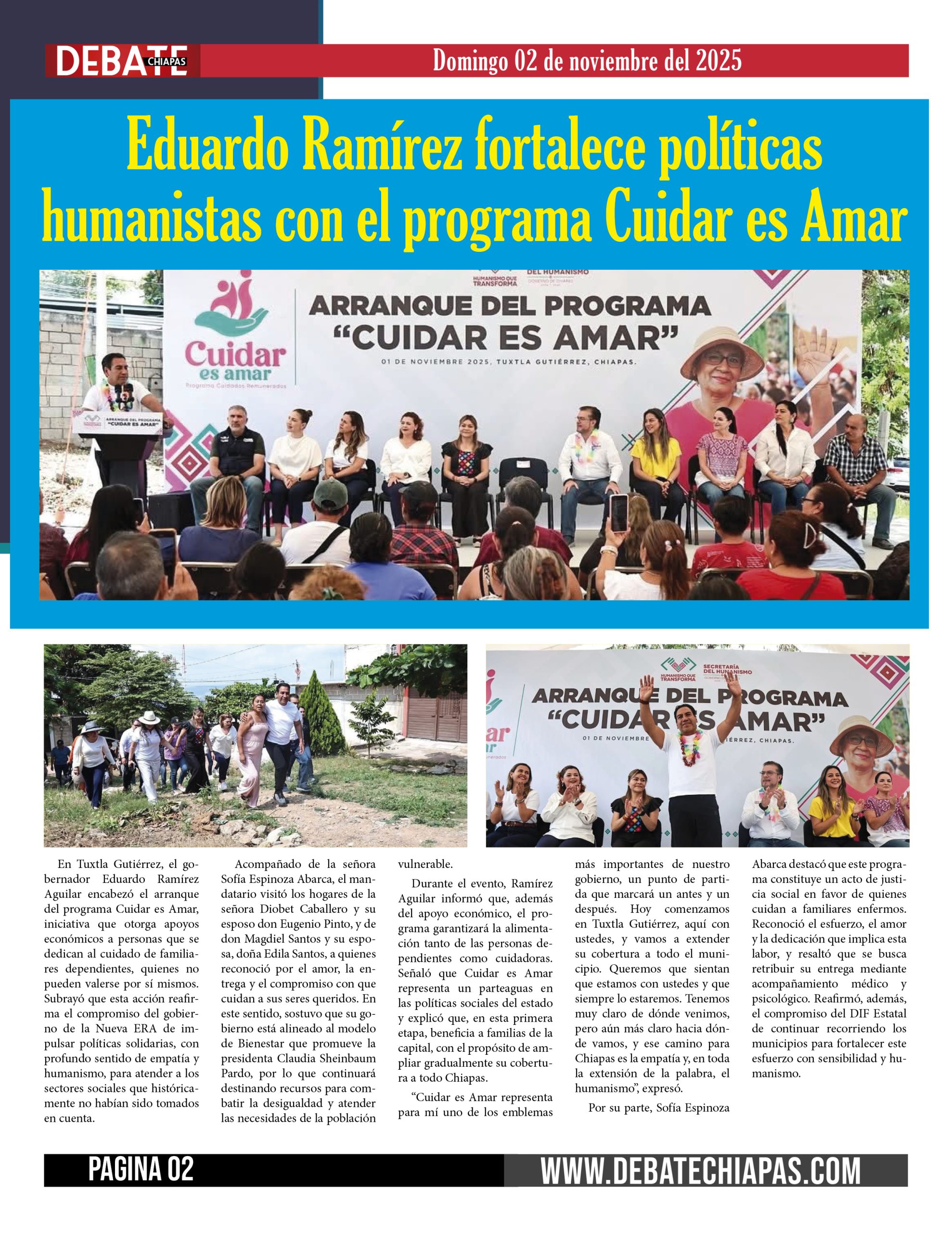 En Tuxtla Gutiérrez, el gobernador Eduardo Ramírez Aguilar encabezó el arranque del programa Cuidar es Amar, iniciativa que otorga apoyos económicos a personas que se dedican al cuidado de familiares dependientes, quienes no pueden valerse por sí mismos. Subrayó que esta acción reafirma el compromiso del gobierno de la Nueva ERA de impulsar políticas solidarias, con profundo sentido de empatía y humanismo, para atender a los sectores sociales que históricamente no habían sido tomados en cuenta.