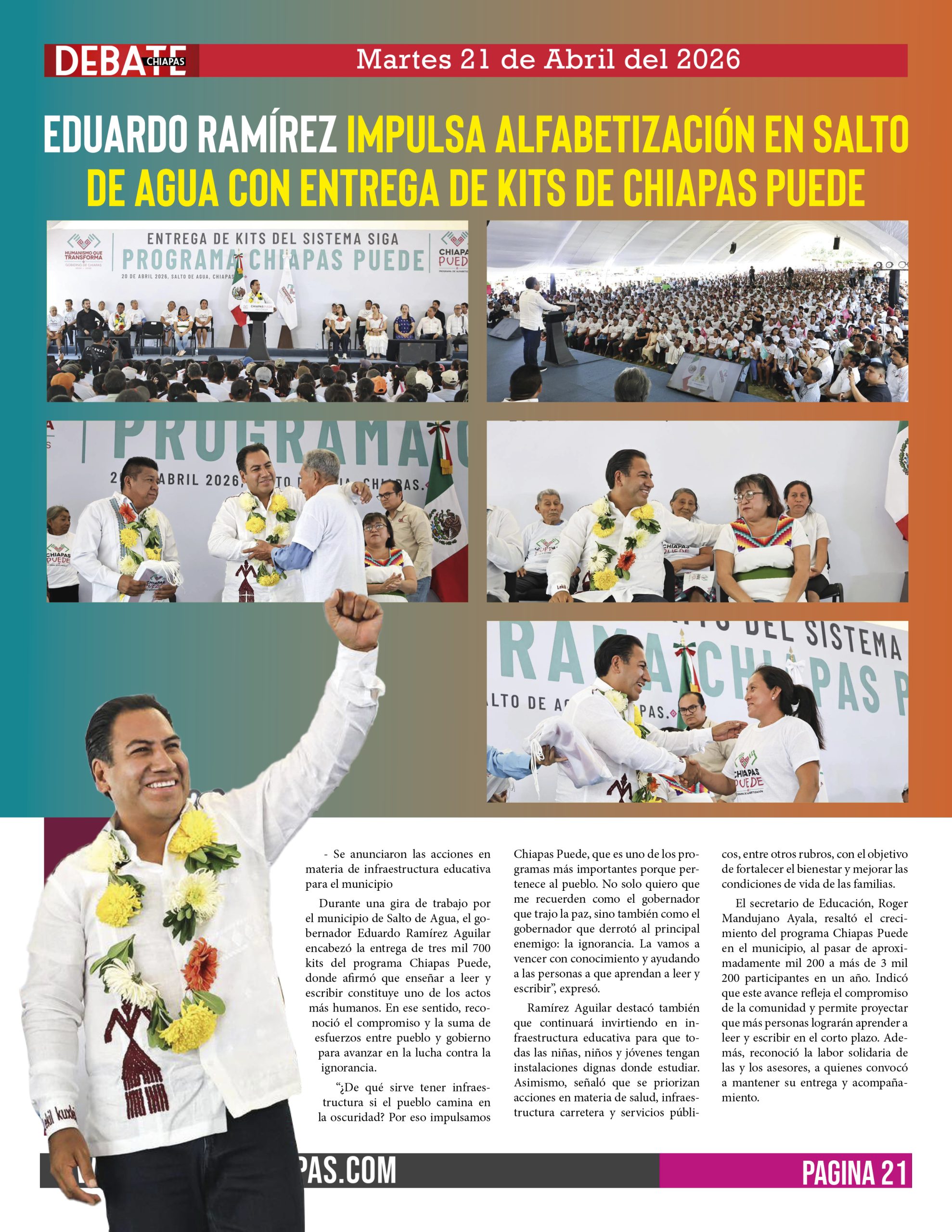 Durante una gira de trabajo por el municipio de Salto de Agua, el gobernador Eduardo Ramírez Aguilar encabezó la entrega de tres mil 700 kits del programa Chiapas Puede, donde afirmó que enseñar a leer y escribir constituye uno de los actos más humanos. En ese sentido, reconoció el compromiso y la suma de esfuerzos entre pueblo y gobierno para avanzar en la lucha contra la ignorancia.