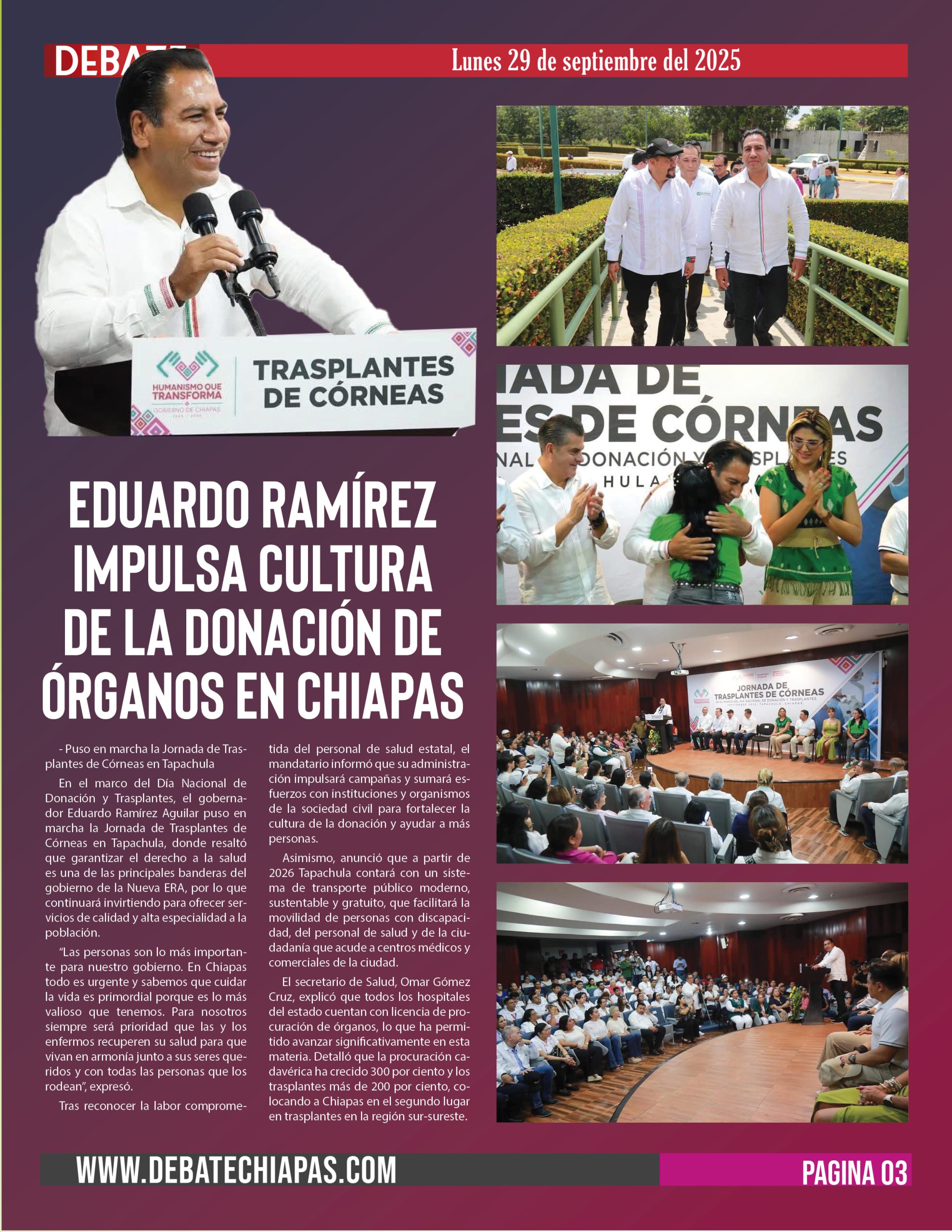El secretario de Salud, Omar Gómez Cruz, explicó que todos los hospitales del estado cuentan con licencia de procuración de órganos, lo que ha permitido avanzar significativamente en esta materia. Detalló que la procuración cadavérica ha crecido 300 por ciento y los trasplantes más de 200 por ciento, colocando a Chiapas en el segundo lugar en trasplantes en la región sur-sureste.