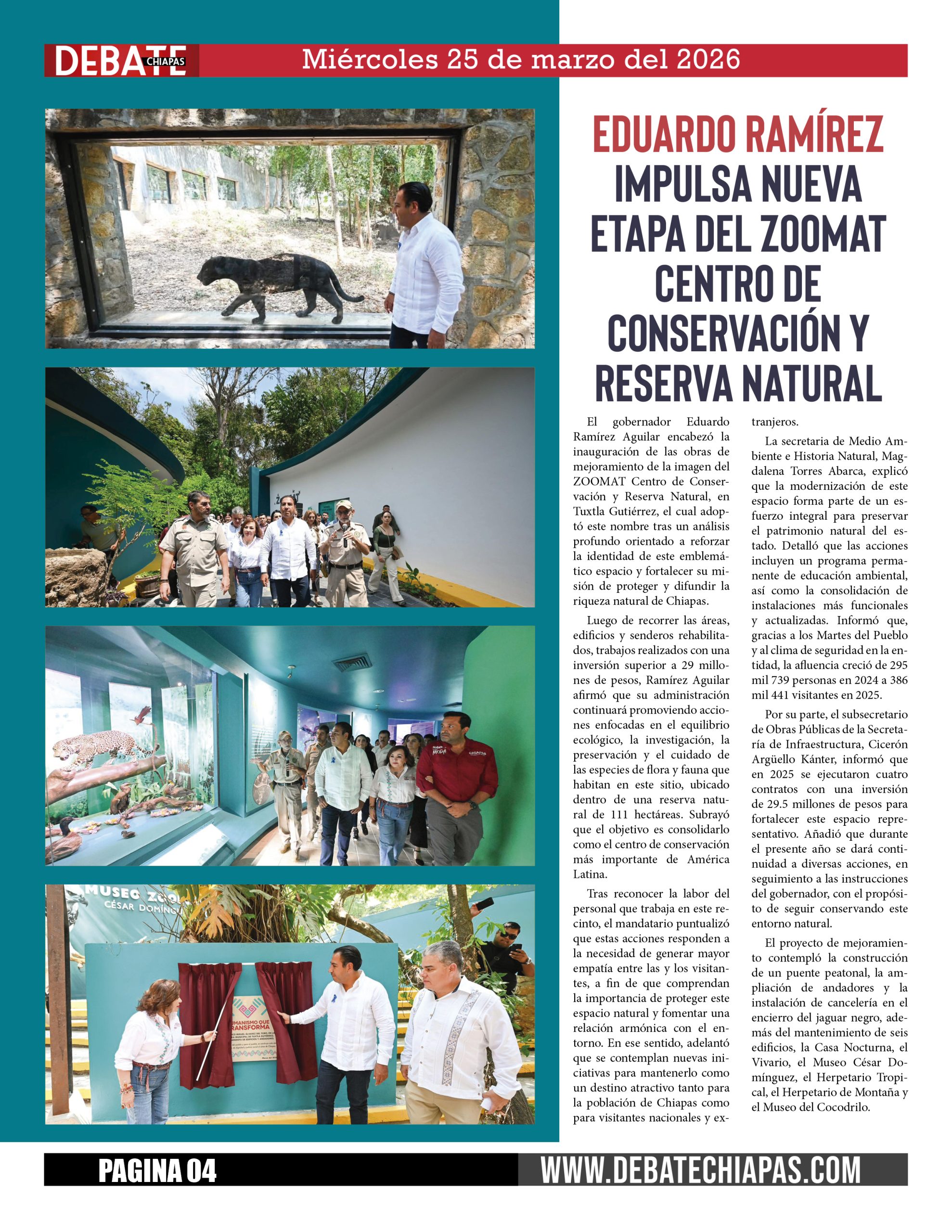 El gobernador Eduardo Ramírez Aguilar encabezó la inauguración de las obras de mejoramiento de la imagen del ZOOMAT Centro de Conservación y Reserva Natural, en Tuxtla Gutiérrez, el cual adoptó este nombre tras un análisis profundo orientado a reforzar la identidad de este emblemático espacio y fortalecer su misión de proteger y difundir la riqueza natural de Chiapas.