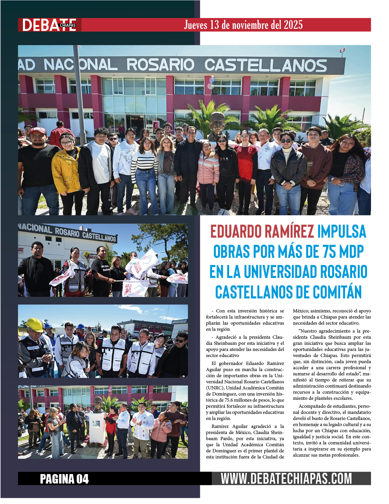 Acompañado de estudiantes, personal docente y directivo, el mandatario develó el busto de Rosario Castellanos, en homenaje a su legado cultural y a su lucha por un Chiapas con educación, igualdad y justicia social. En este contexto, invitó a la comunidad universitaria a inspirarse en su ejemplo para alcanzar sus metas profesionales.