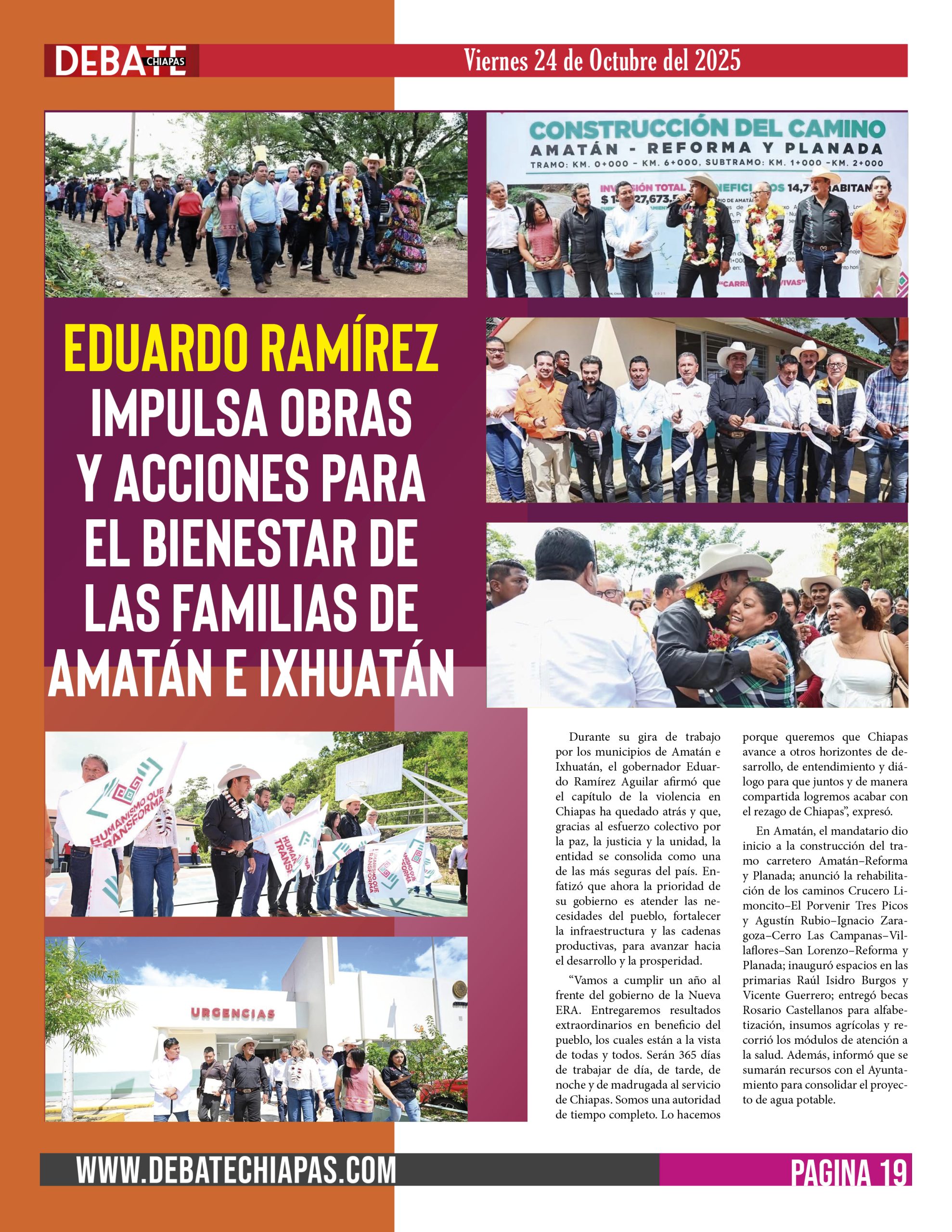 En Amatán, el mandatario dio inicio a la construcción del tramo carretero Amatán–Reforma y Planada; anunció la rehabilitación de los caminos Crucero Limoncito–El Porvenir Tres Picos y Agustín Rubio–Ignacio Zaragoza–Cerro Las Campanas–Villaflores–San Lorenzo–Reforma y Planada; inauguró espacios en las primarias Raúl Isidro Burgos y Vicente Guerrero; entregó becas Rosario Castellanos para alfabetización, insumos agrícolas y recorrió los módulos de atención a la salud. Además, informó que se sumarán recursos con el Ayuntamiento para consolidar el proyecto de agua potable.