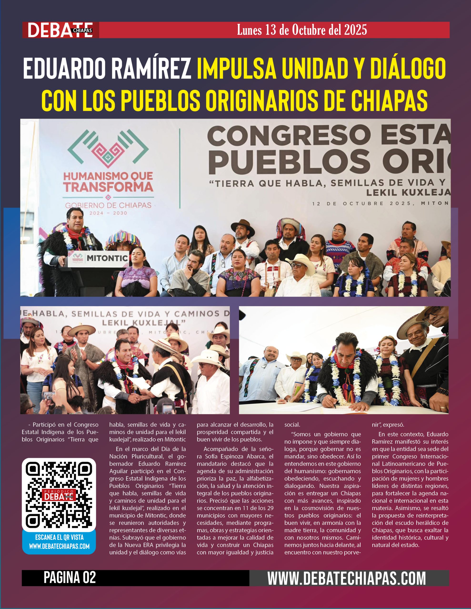 En el marco del Día de la Nación Pluricultural, el gobernador Eduardo Ramírez Aguilar participó en el Congreso Estatal Indígena de los Pueblos Originarios “Tierra que habla, semillas de vida y caminos de unidad para el lekil kuxlejal”, realizado en el municipio de Mitontic, donde se reunieron autoridades y representantes de diversas etnias. Subrayó que el gobierno de la Nueva ERA privilegia la unidad y el diálogo como vías para alcanzar el desarrollo, la prosperidad compartida y el buen vivir de los pueblos.