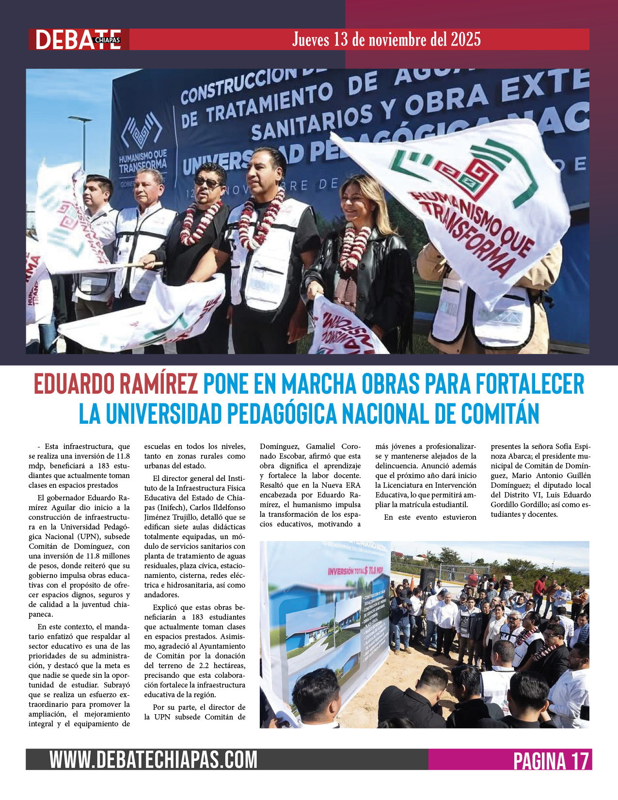 El gobernador Eduardo Ramírez Aguilar dio inicio a la construcción de infraestructura en la Universidad Pedagógica Nacional (UPN), subsede Comitán de Domínguez, con una inversión de 11.8 millones de pesos, donde reiteró que su gobierno impulsa obras educativas con el propósito de ofrecer espacios dignos, seguros y de calidad a la juventud chiapaneca.