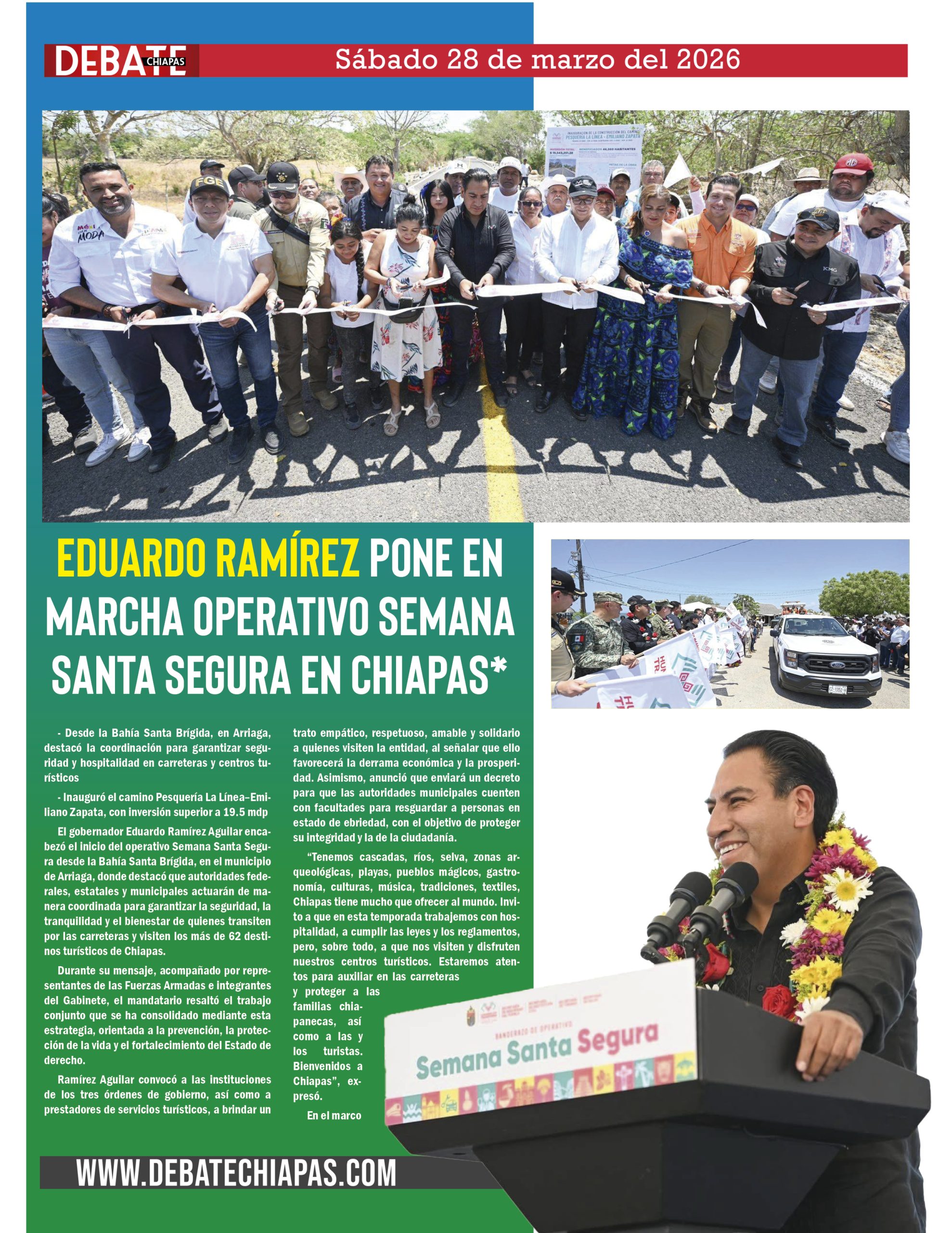El gobernador Eduardo Ramírez Aguilar encabezó el inicio del operativo Semana Santa Segura desde la Bahía Santa Brígida, en el municipio de Arriaga, donde destacó que autoridades federales, estatales y municipales actuarán de manera coordinada para garantizar la seguridad, la tranquilidad y el bienestar de quienes transiten por las carreteras y visiten los más de 62 destinos turísticos de Chiapas.