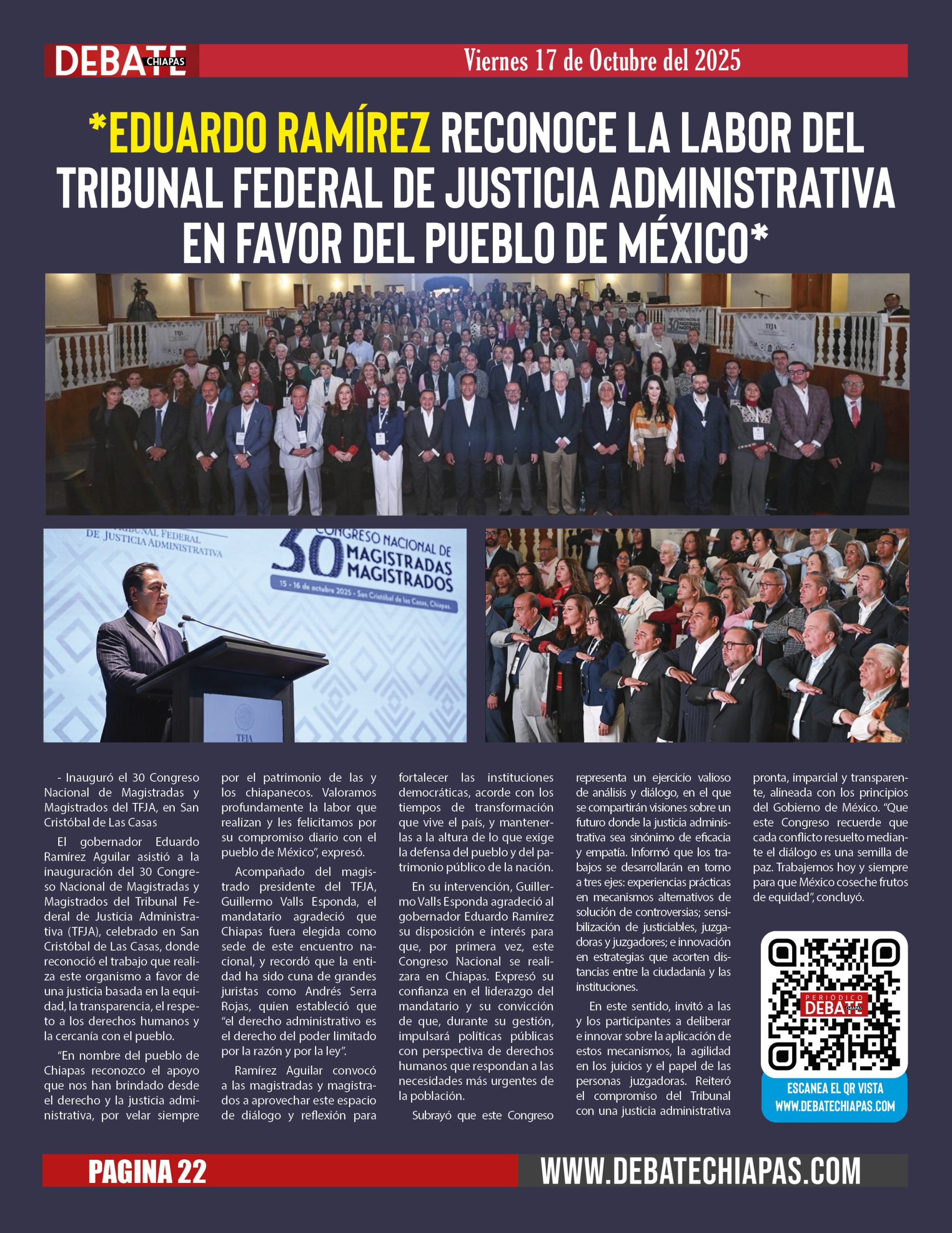 “En nombre del pueblo de Chiapas reconozco el apoyo que nos han brindado desde el derecho y la justicia administrativa, por velar siempre por el patrimonio de las y los chiapanecos. Valoramos profundamente la labor que realizan y les felicitamos por su compromiso diario con el pueblo de México”, expresó.