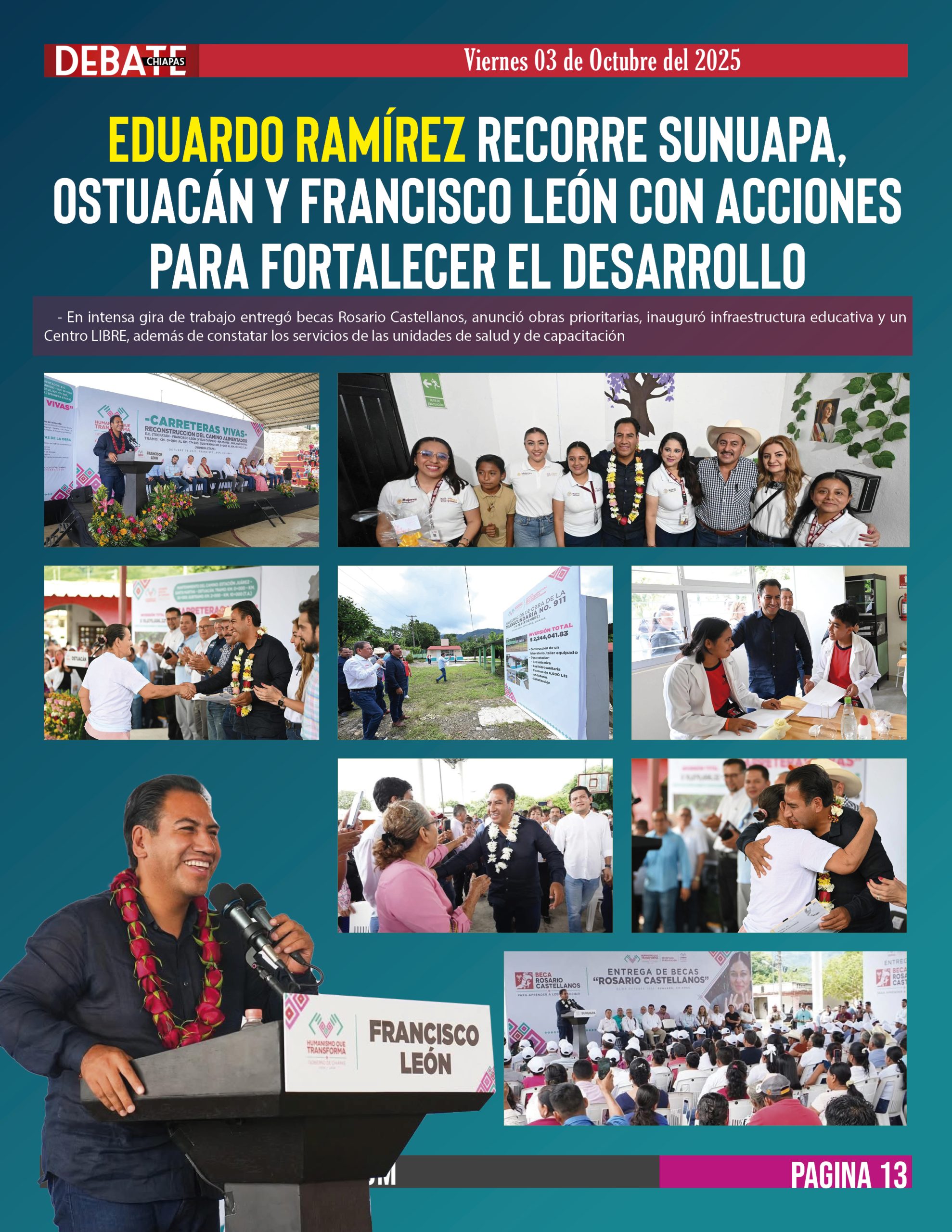 En Ostuacán, informó sobre el mantenimiento del camino Estación Juárez-Santa Martha-Ostuacán y otras obras prioritarias. Atestiguó los servicios de los módulos de salud y las aulas móviles de capacitación, además de inaugurar el Centro LIBRE del Programa Integral para la Atención de las Mujeres (Paibim). Señaló que sumará esfuerzos con el Ayuntamiento para consolidar el proyecto del mercado municipal. En materia educativa, inauguró espacios en la Telesecundaria 911, anunció infraestructura en el Jardín de Niñas y Niños Miguel Hidalgo y Costilla y entregó becas de alfabetización, precisando que el siguiente paso será apoyar a quienes deseen continuar sus estudios.