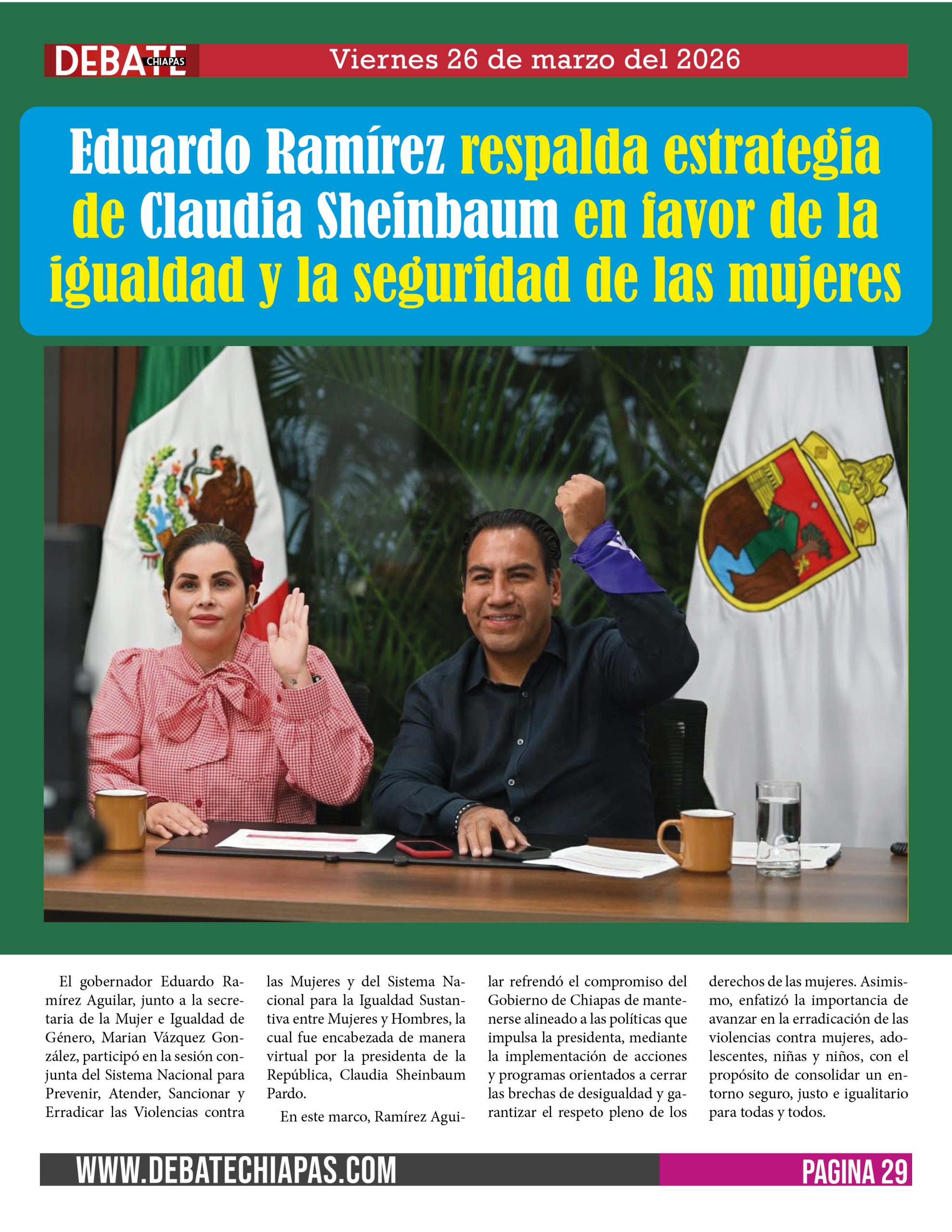 En este marco, Ramírez Aguilar refrendó el compromiso del Gobierno de Chiapas de mantenerse alineado a las políticas que impulsa la presidenta, mediante la implementación de acciones y programas orientados a cerrar las brechas de desigualdad y garantizar el respeto pleno de los derechos de las mujeres. Asimismo, enfatizó la importancia de avanzar en la erradicación de las violencias contra mujeres, adolescentes, niñas y niños, con el propósito de consolidar un entorno seguro, justo e igualitario para todas y todos.