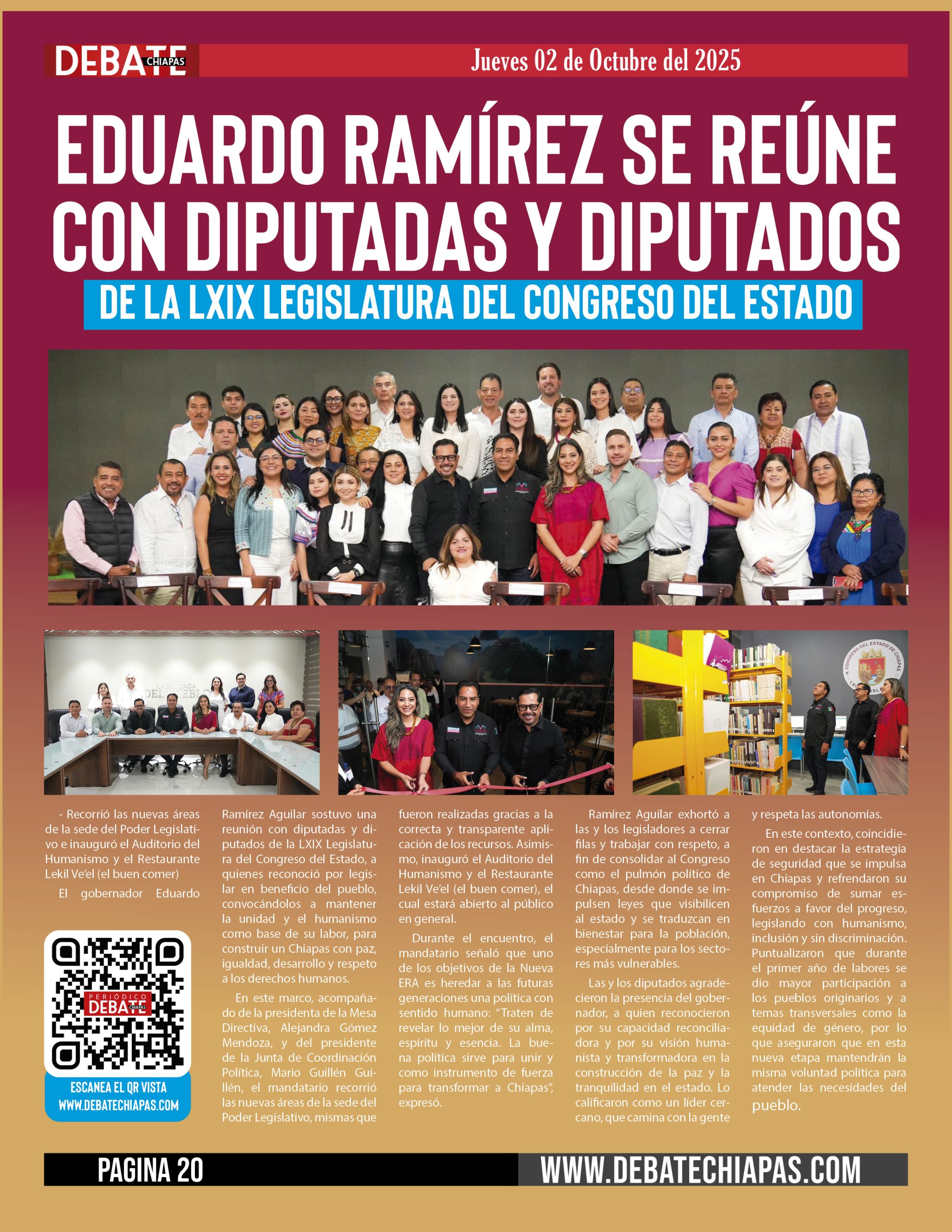 El gobernador Eduardo Ramírez Aguilar sostuvo una reunión con diputadas y diputados de la LXIX Legislatura del Congreso del Estado, a quienes reconoció por legislar en beneficio del pueblo, convocándolos a mantener la unidad y el humanismo como base de su labor, para construir un Chiapas con paz, igualdad, desarrollo y respeto a los derechos humanos.