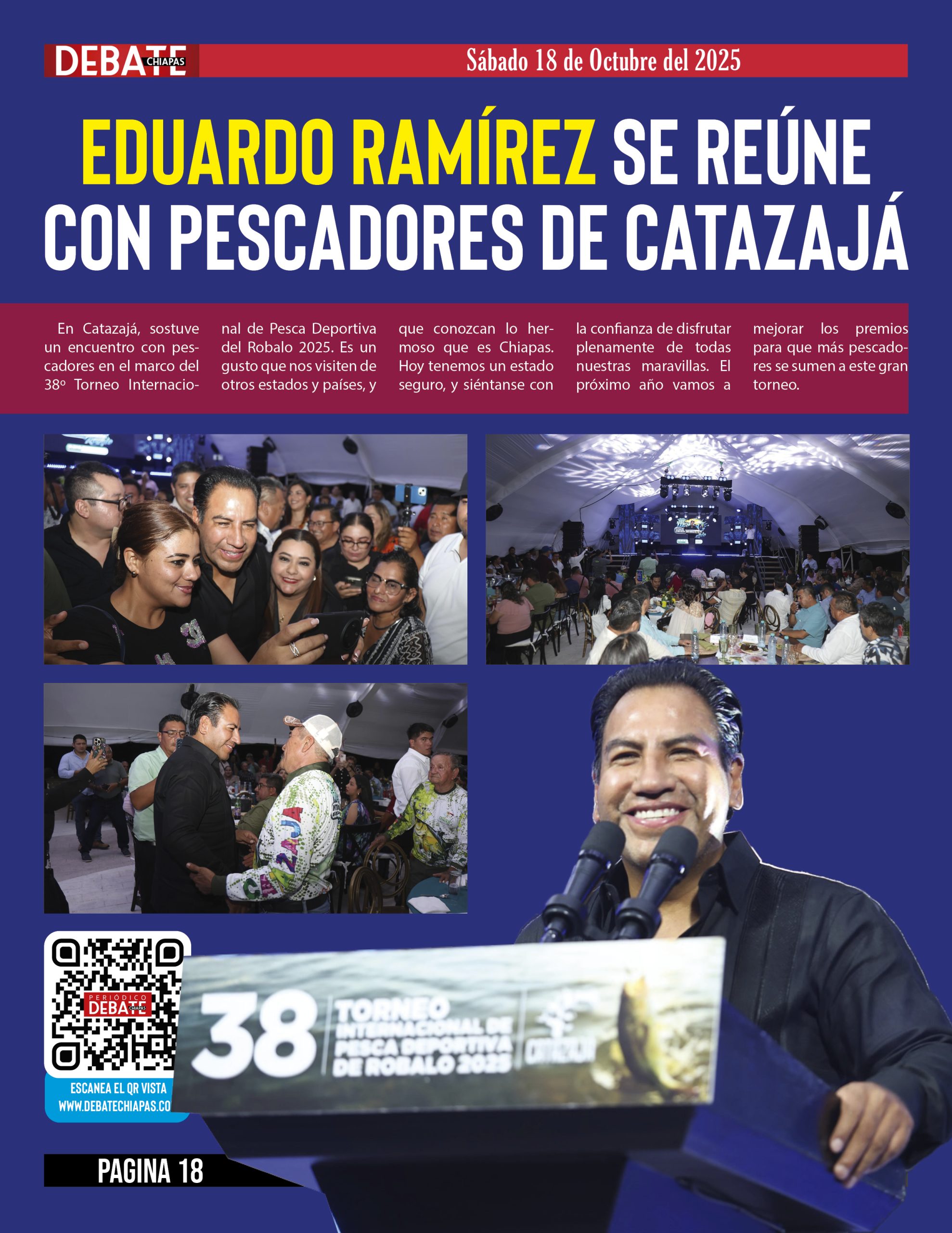 En Catazajá, sostuve un encuentro con pescadores en el marco del 38º Torneo Internacional de Pesca Deportiva del Robalo 2025. Es un gusto que nos visiten de otros estados y países, y que conozcan lo hermoso que es Chiapas. Hoy tenemos un estado seguro, y siéntanse con la confianza de disfrutar plenamente de todas nuestras maravillas. El próximo año vamos a mejorar los premios para que más pescadores se sumen a este gran torneo.