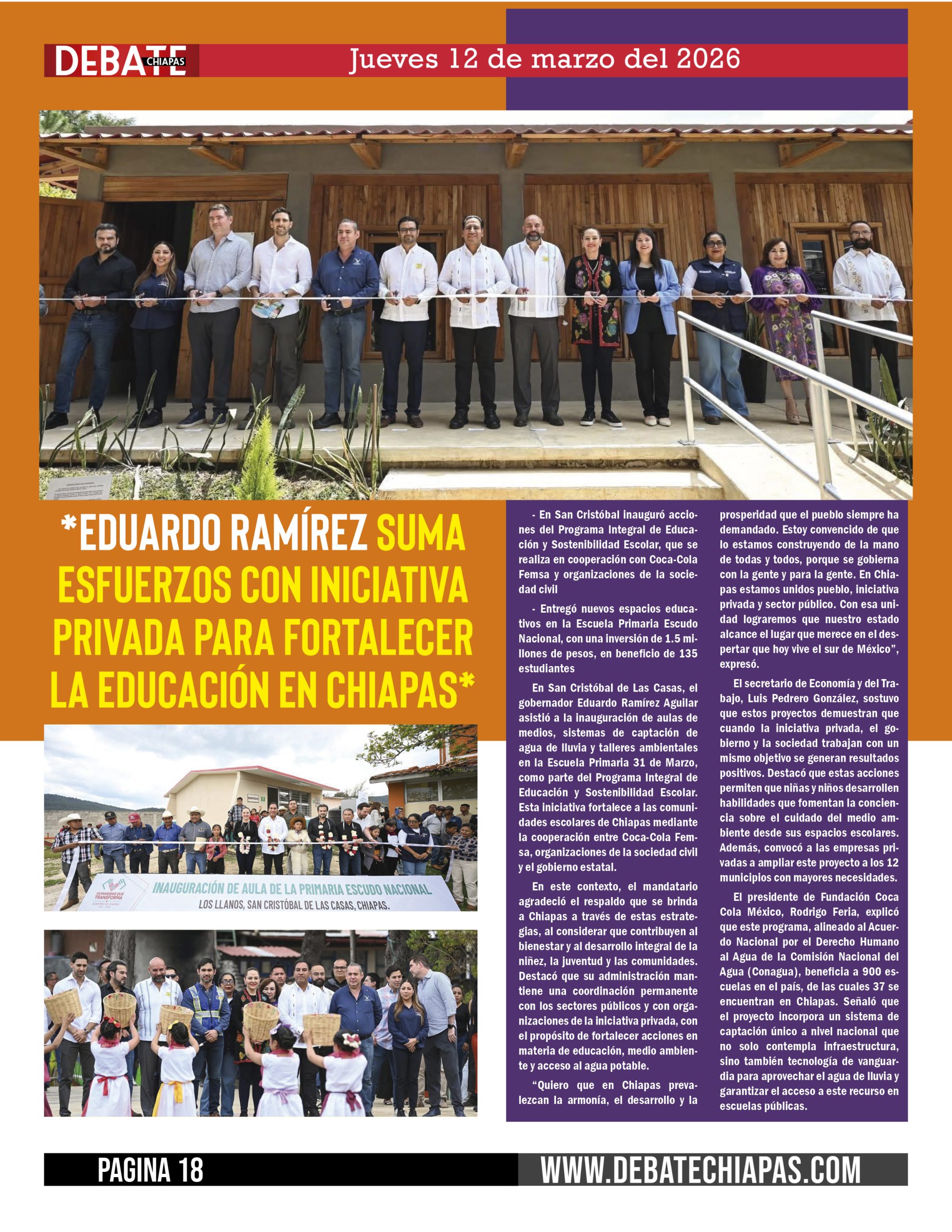 En San Cristóbal de Las Casas, el gobernador Eduardo Ramírez Aguilar asistió a la inauguración de aulas de medios, sistemas de captación de agua de lluvia y talleres ambientales en la Escuela Primaria 31 de Marzo, como parte del Programa Integral de Educación y Sostenibilidad Escolar. Esta iniciativa fortalece a las comunidades escolares de Chiapas mediante la cooperación entre Coca-Cola Femsa, organizaciones de la sociedad civil y el gobierno estatal.