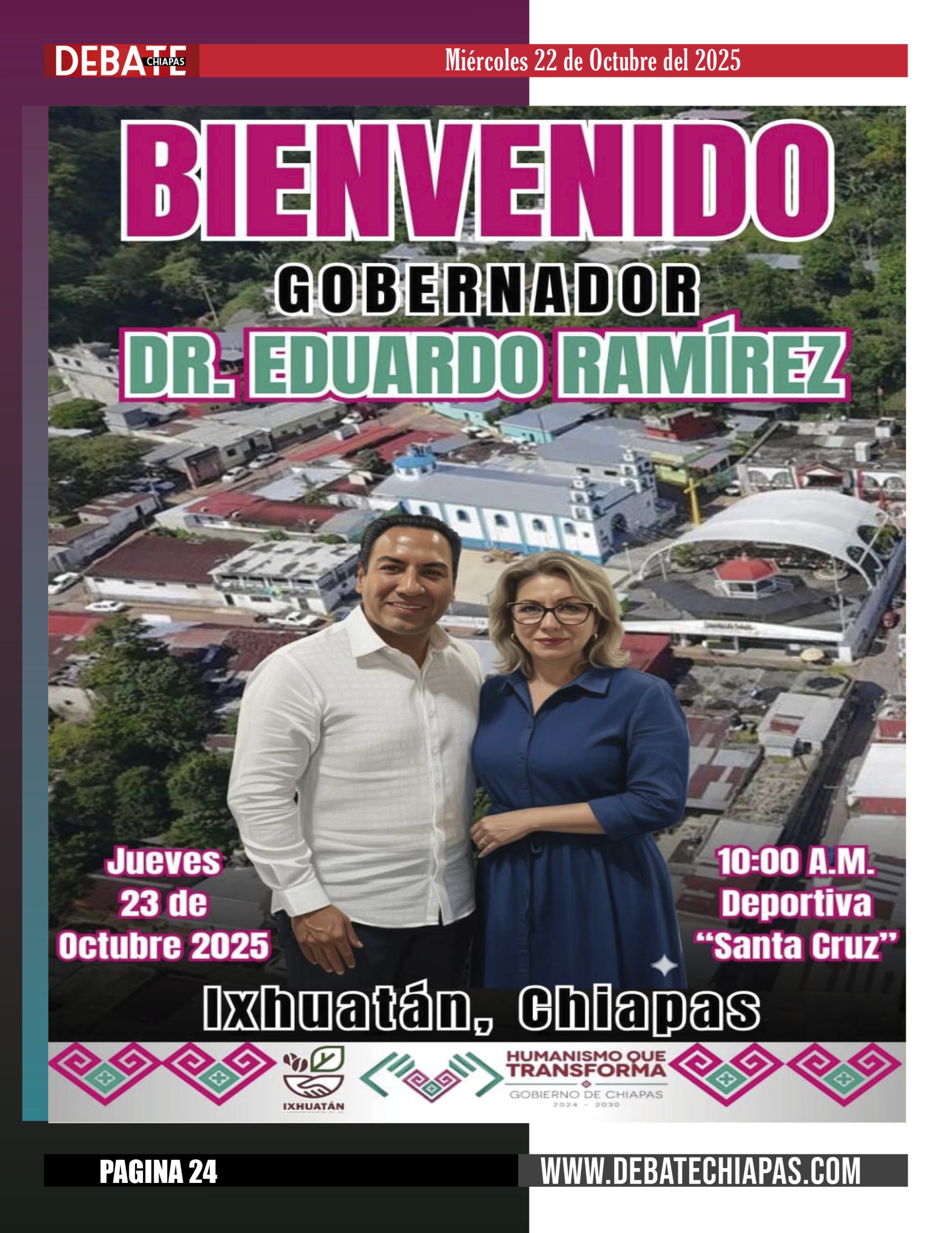 Recibamos juntos con gran entusiasmo a nuestro Gobernador de Chiapas en su visita a nuestro Municipio de Ixhuatán, el día 23 de octubre de 2025, a las 10 de la mañana en la Unidad Deportiva “santa Cruz”.