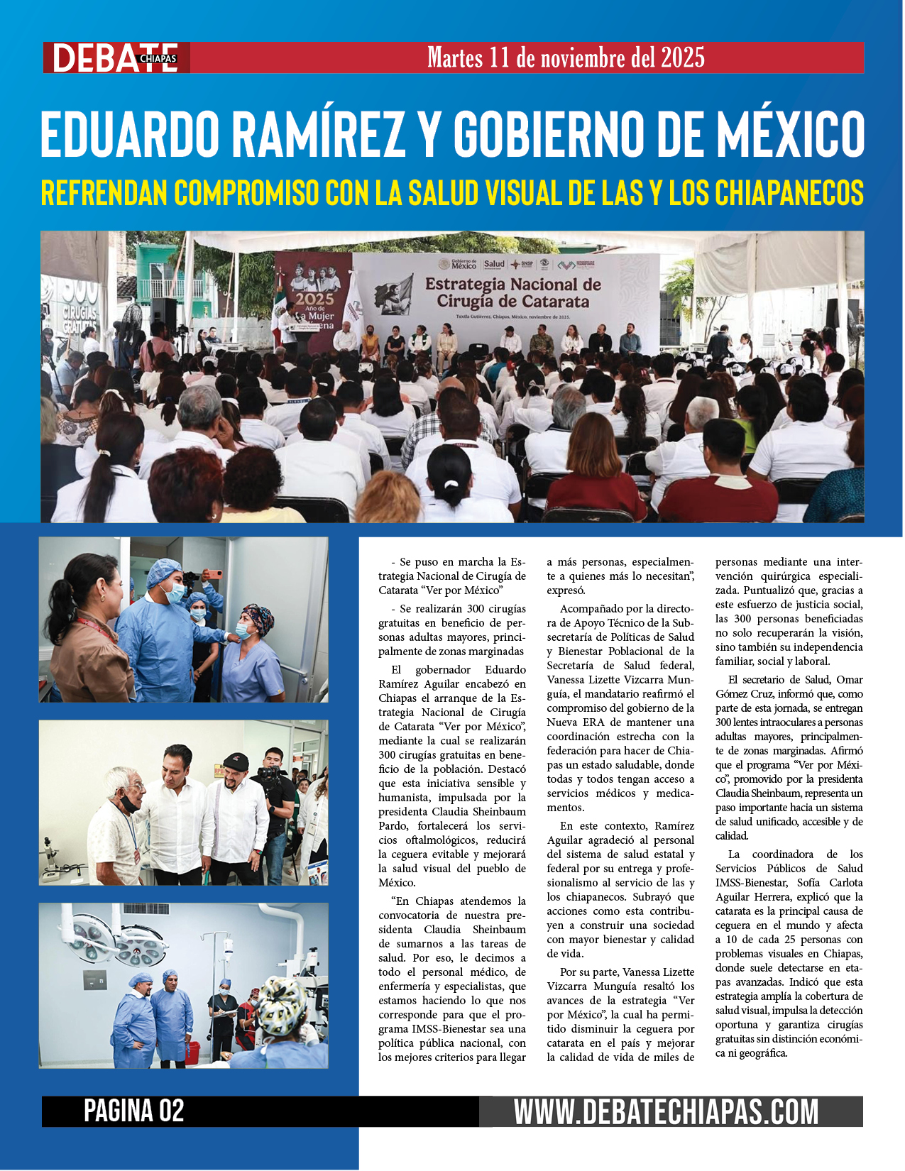 El gobernador Eduardo Ramírez Aguilar encabezó en Chiapas el arranque de la Estrategia Nacional de Cirugía de Catarata “Ver por México”, mediante la cual se realizarán 300 cirugías gratuitas en beneficio de la población. Destacó que esta iniciativa sensible y humanista, impulsada por la presidenta Claudia Sheinbaum Pardo, fortalecerá los servicios oftalmológicos, reducirá la ceguera evitable y mejorará la salud visual del pueblo de México.