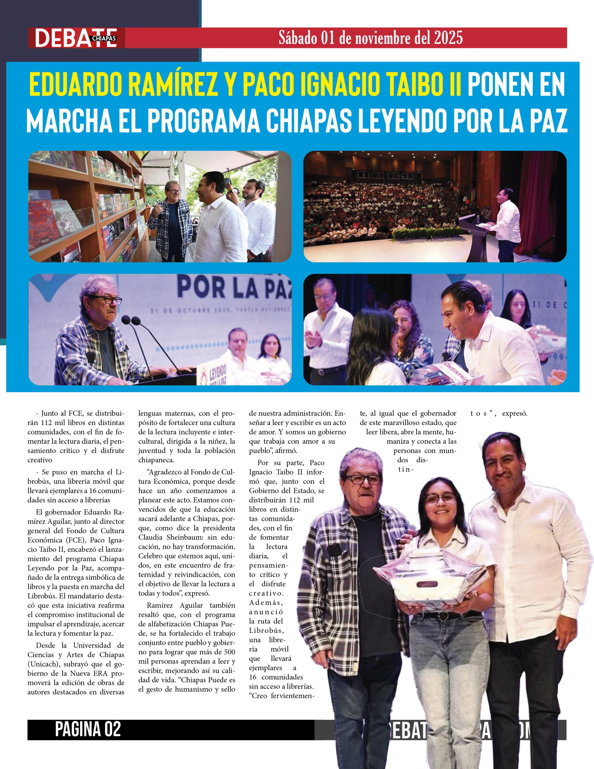 El gobernador Eduardo Ramírez Aguilar, junto al director general del Fondo de Cultura Económica (FCE), Paco Ignacio Taibo II, encabezó el lanzamiento del programa Chiapas Leyendo por la Paz, acompañado de la entrega simbólica de libros y la puesta en marcha del Librobús. El mandatario destacó que esta iniciativa reafirma el compromiso institucional de impulsar el aprendizaje, acercar la lectura y fomentar la paz.