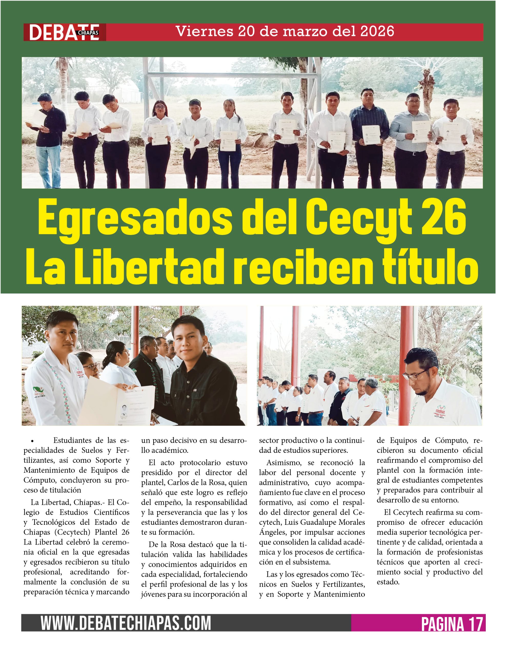 La Libertad, Chiapas.- El Colegio de Estudios Científicos y Tecnológicos del Estado de Chiapas (Cecytech) Plantel 26 La Libertad celebró la ceremonia oficial en la que egresadas y egresados recibieron su título profesional, acreditando formalmente la conclusión de su preparación técnica y marcando un paso decisivo en su desarrollo académico.