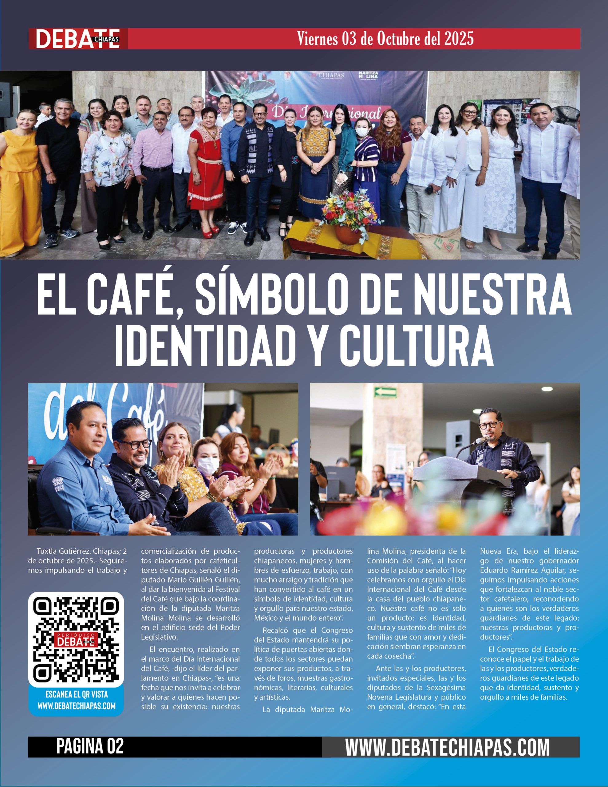 La diputada Maritza Molina Molina, presidenta de la Comisión del Café, al hacer uso de la palabra señaló: “Hoy celebramos con orgullo el Día Internacional del Café desde la casa del pueblo chiapaneco. Nuestro café no es solo un producto: es identidad, cultura y sustento de miles de familias que con amor y dedicación siembran esperanza en cada cosecha”.