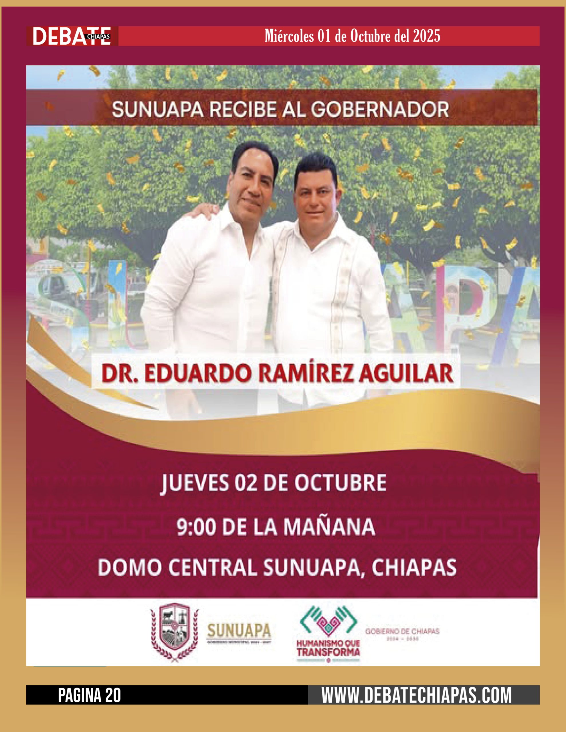 El Gobierno Municipal Sunuapa 2024 – 2027 que encabeza el Lic. Fredi Ramirez Diaz, hace una atenta y cordial invitación a toda la ciudadanía para dar la bienvenida al gobernador del estado Dr. Eduardo Ramírez, donde escucharemos el mensaje que ambos tienen para todos a un año del inicio de la Nueva ERA en la transformación de Sunuapa.