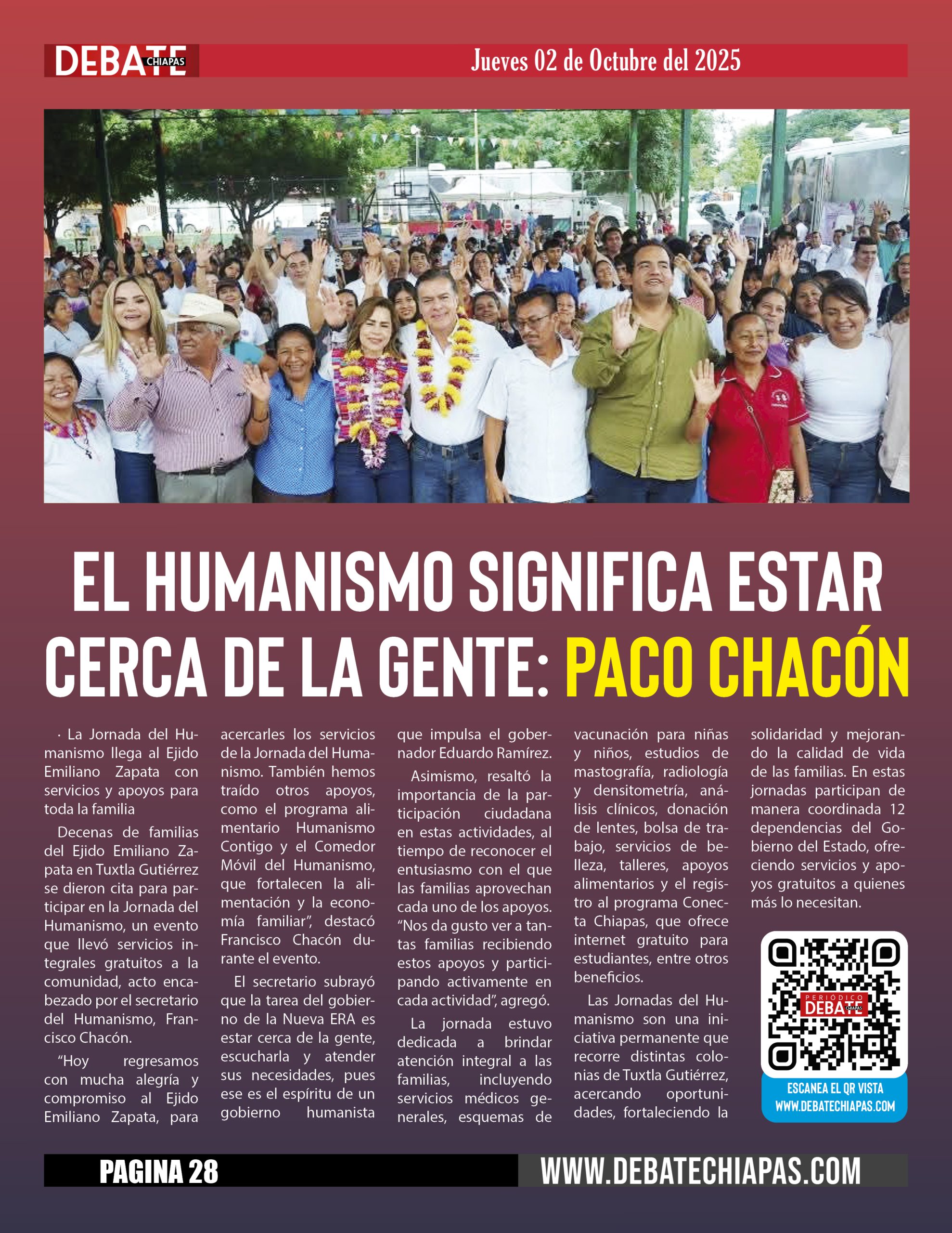 Decenas de familias del Ejido Emiliano Zapata en Tuxtla Gutiérrez se dieron cita para participar en la Jornada del Humanismo, un evento que llevó servicios integrales gratuitos a la comunidad, acto encabezado por el secretario del Humanismo, Francisco Chacón.