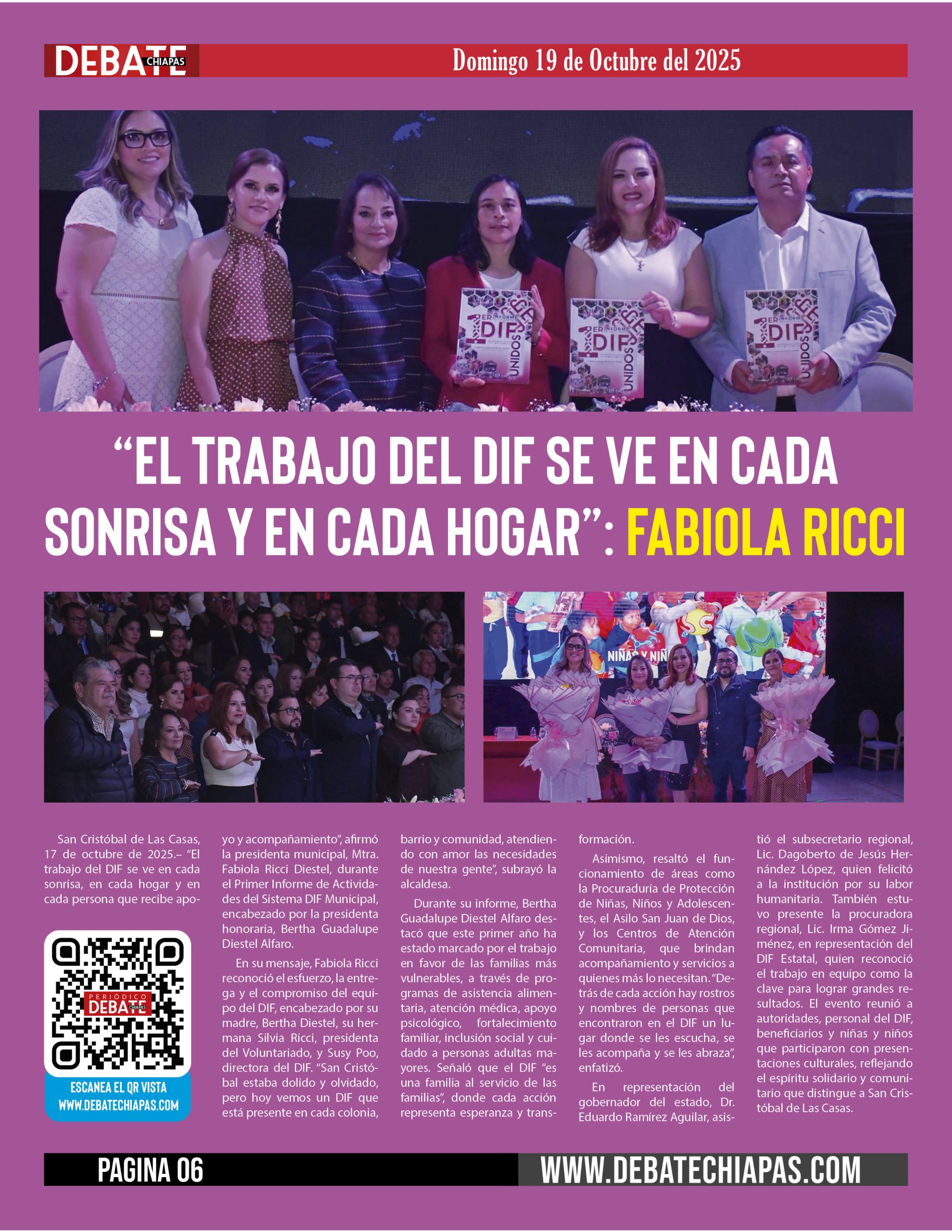 San Cristóbal de Las Casas, 17 de octubre de 2025.– “El trabajo del DIF se ve en cada sonrisa, en cada hogar y en cada persona que recibe apoyo y acompañamiento”, afirmó la presidenta municipal, Mtra. Fabiola Ricci Diestel, durante el Primer Informe de Actividades del Sistema DIF Municipal, encabezado por la presidenta honoraria, Bertha Guadalupe Diestel Alfaro.