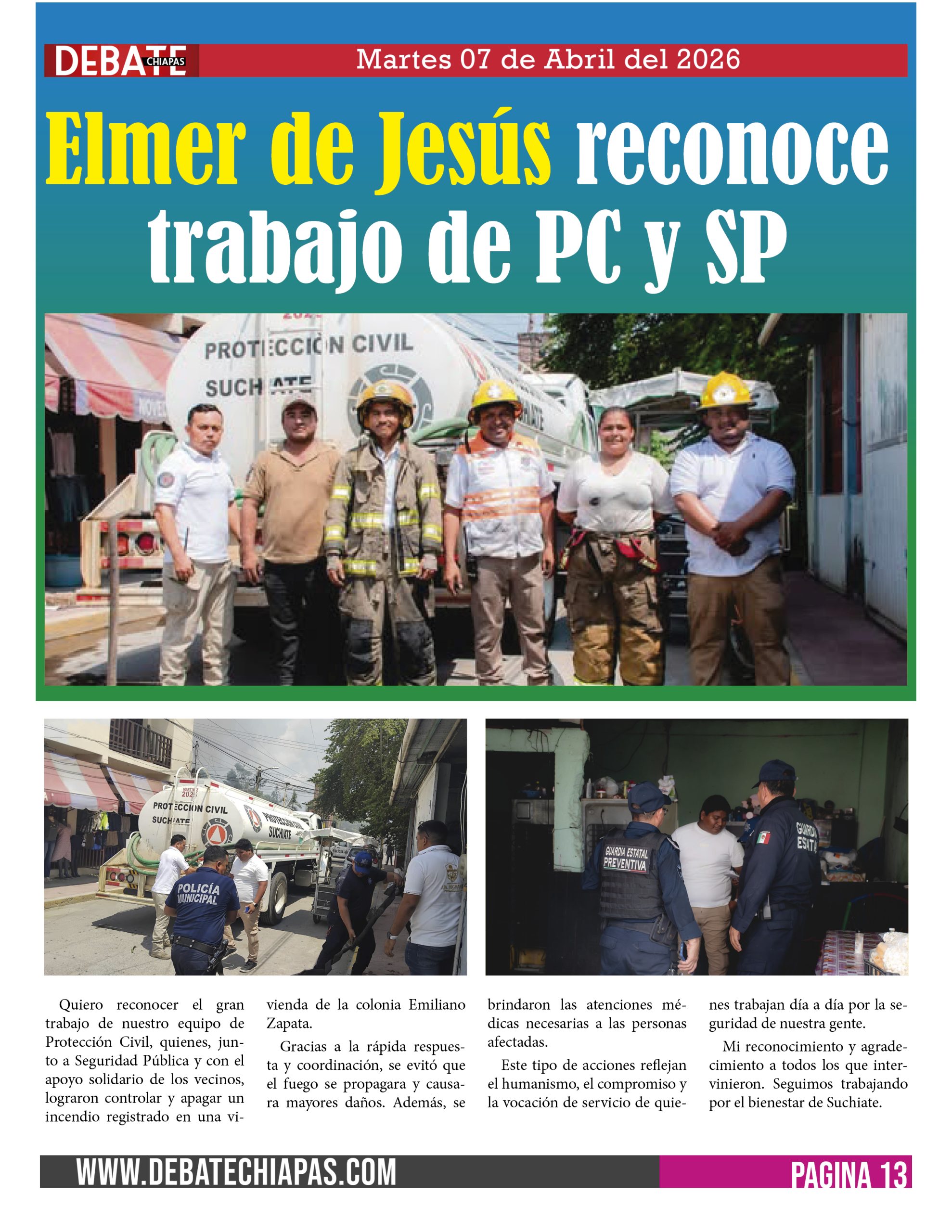 Quiero reconocer el gran trabajo de nuestro equipo de Protección Civil, quienes, junto a Seguridad Pública y con el apoyo solidario de los vecinos, lograron controlar y apagar un incendio registrado en una vivienda de la colonia Emiliano Zapata.