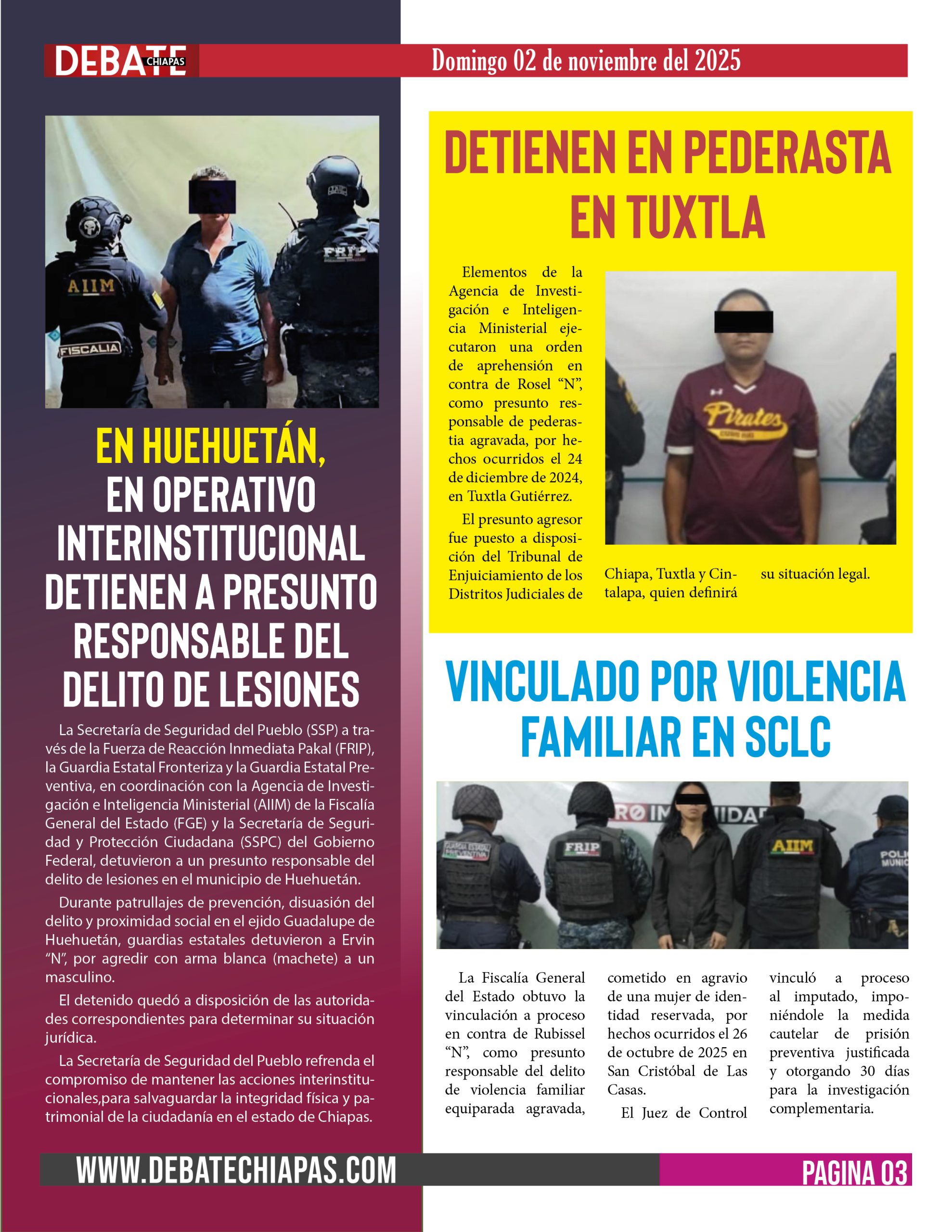 La Secretaría de Seguridad del Pueblo (SSP) a través de la Fuerza de Reacción Inmediata Pakal (FRIP), la Guardia Estatal Fronteriza y la Guardia Estatal Preventiva, en coordinación con la Agencia de Investigación e Inteligencia Ministerial (AIIM) de la Fiscalía General del Estado (FGE) y la Secretaría de Seguridad y Protección Ciudadana (SSPC) del Gobierno Federal, detuvieron a un presunto responsable del delito de lesiones en el municipio de Huehuetán.