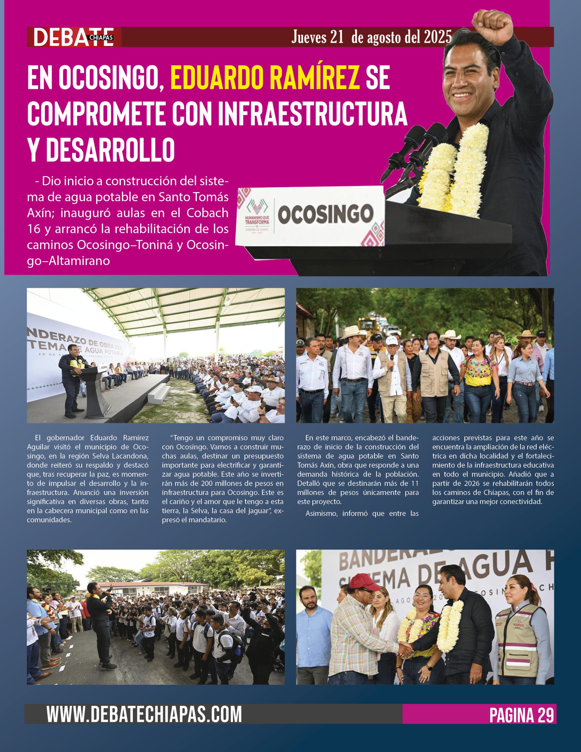 – Dio inicio a construcción del sistema de agua potable en Santo Tomás Axín; inauguró aulas en el Cobach 16 y arrancó la rehabilitación de los caminos Ocosingo–Toniná y Ocosingo–Altamirano