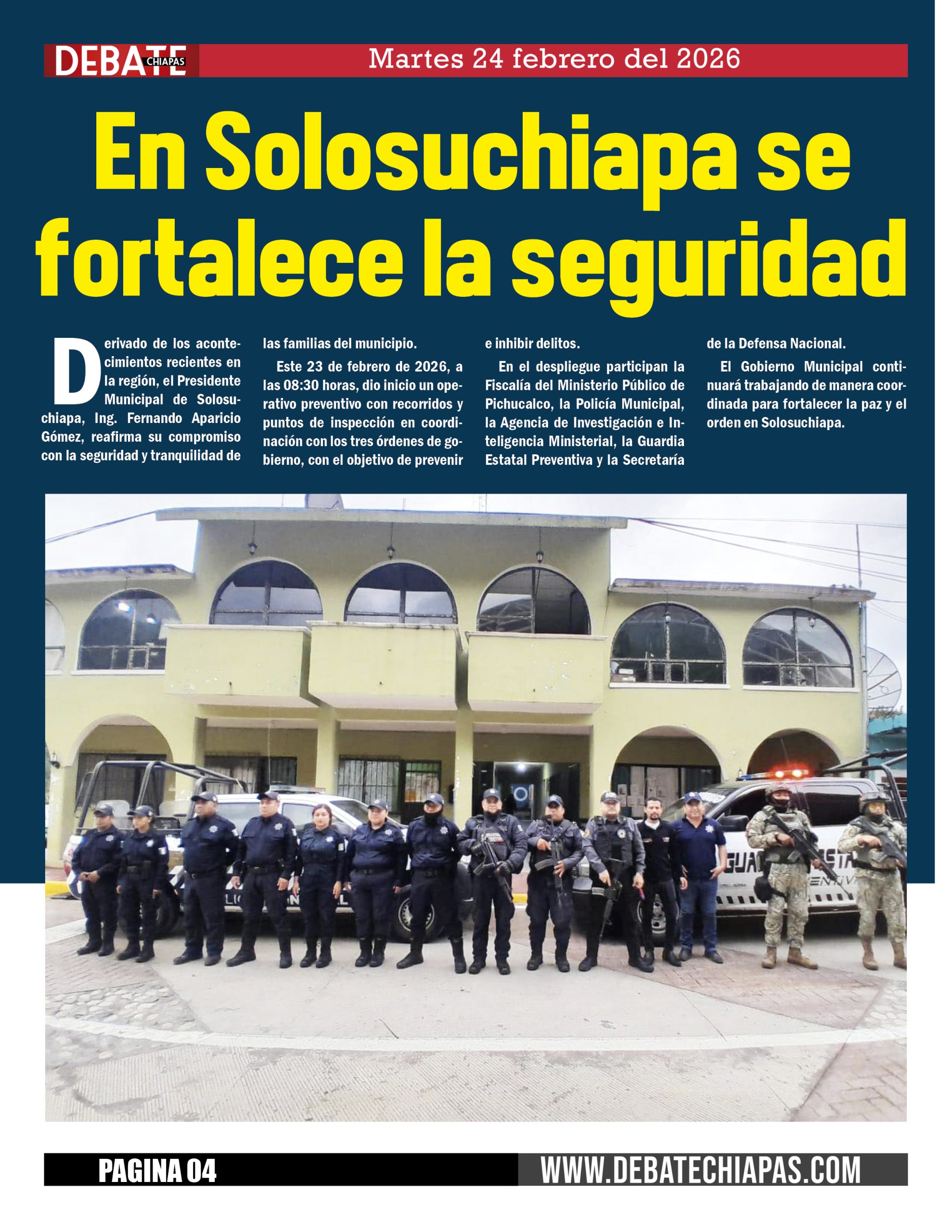 En el despliegue participan la Fiscalía del Ministerio Público de Pichucalco, la Policía Municipal, la Agencia de Investigación e Inteligencia Ministerial, la Guardia Estatal Preventiva y la Secretaría de la Defensa Nacional.