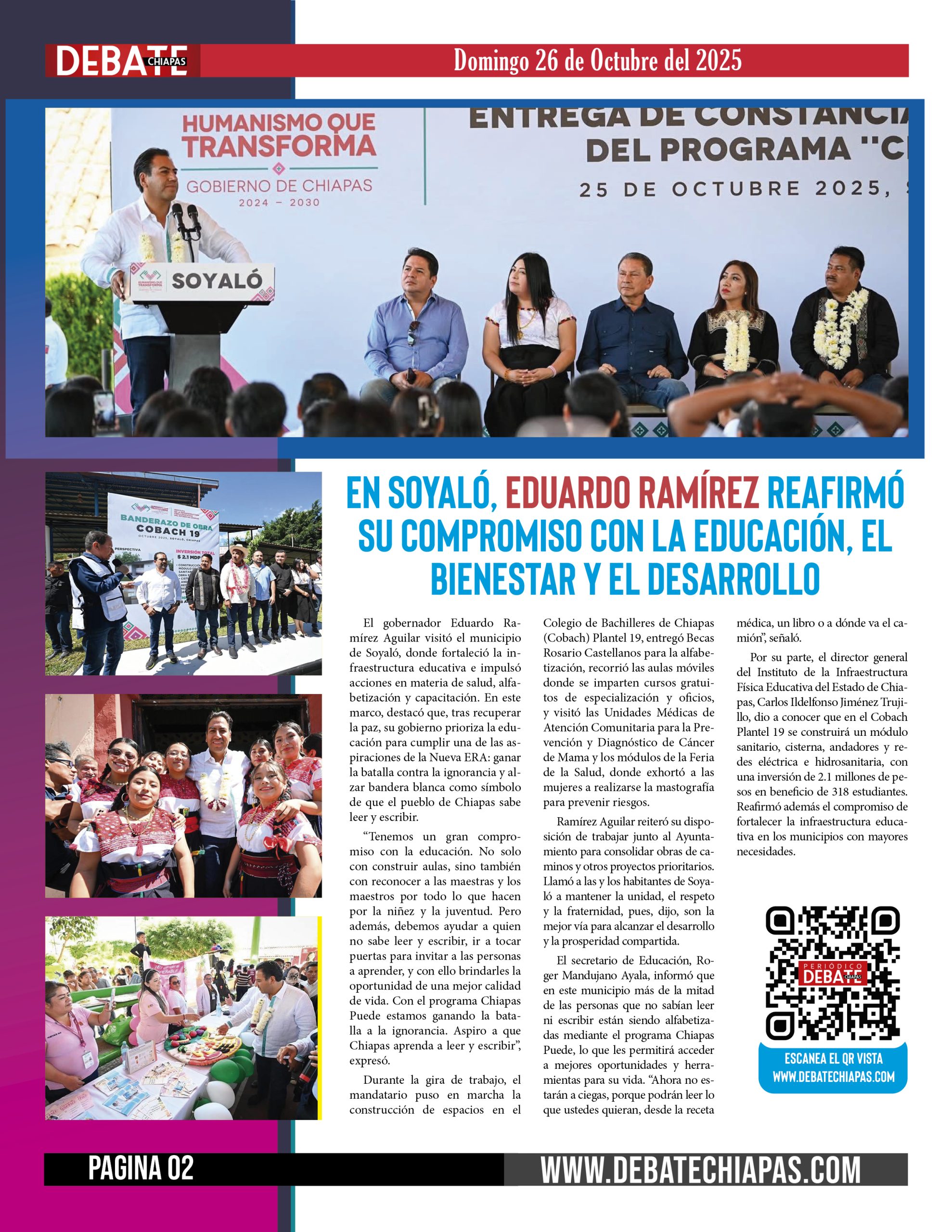 El gobernador Eduardo Ramírez Aguilar visitó el municipio de Soyaló, donde fortaleció la infraestructura educativa e impulsó acciones en materia de salud, alfabetización y capacitación. En este marco, destacó que, tras recuperar la paz, su gobierno prioriza la educación para cumplir una de las aspiraciones de la Nueva ERA: ganar la batalla contra la ignorancia y alzar bandera blanca como símbolo de que el pueblo de Chiapas sabe leer y escribir.