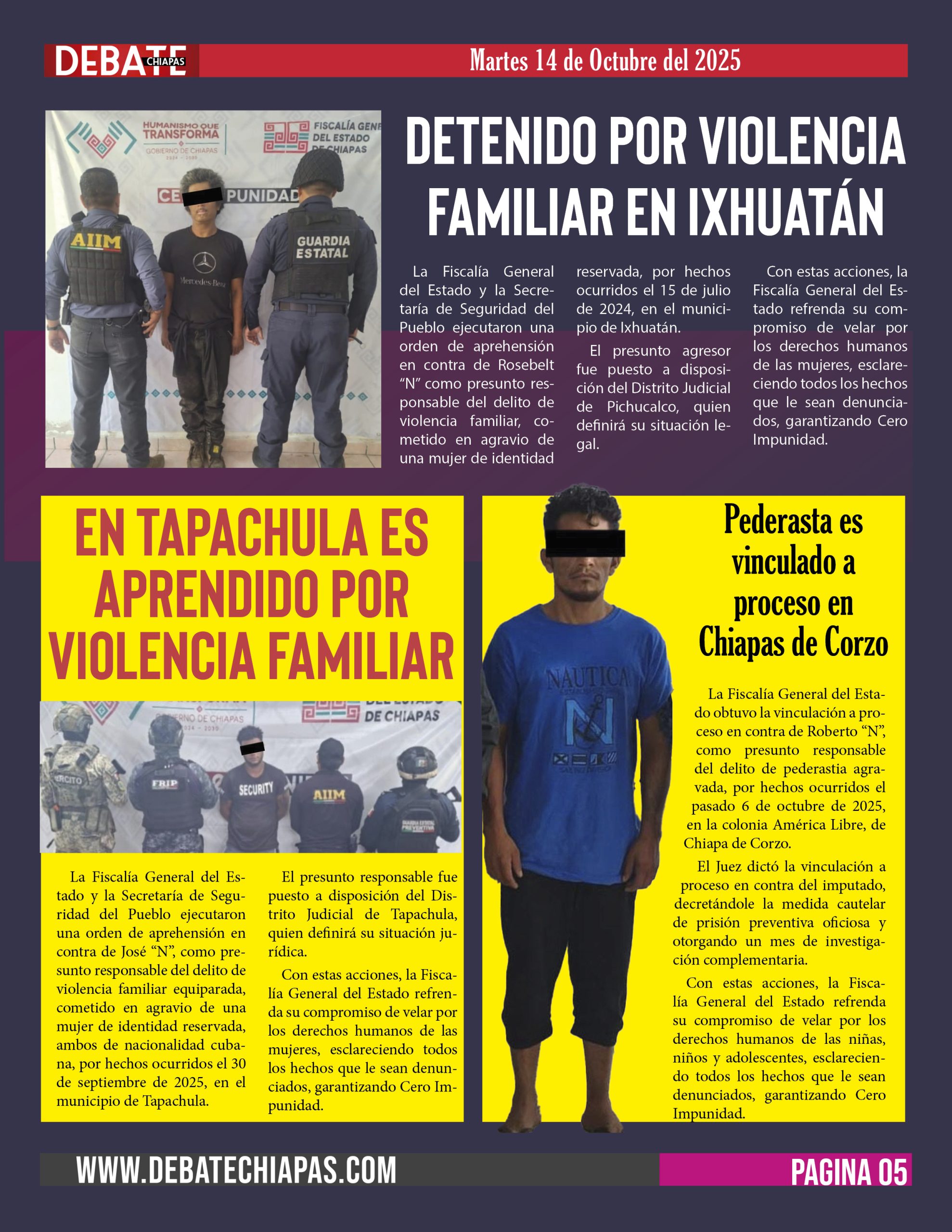 La Fiscalía General del Estado y la Secretaría de Seguridad del Pueblo ejecutaron una orden de aprehensión en contra de José “N”, como presunto responsable del delito de violencia familiar equiparada, cometido en agravio de una mujer de identidad reservada, ambos de nacionalidad cubana, por hechos ocurridos el 30 de septiembre de 2025, en el municipio de Tapachula.