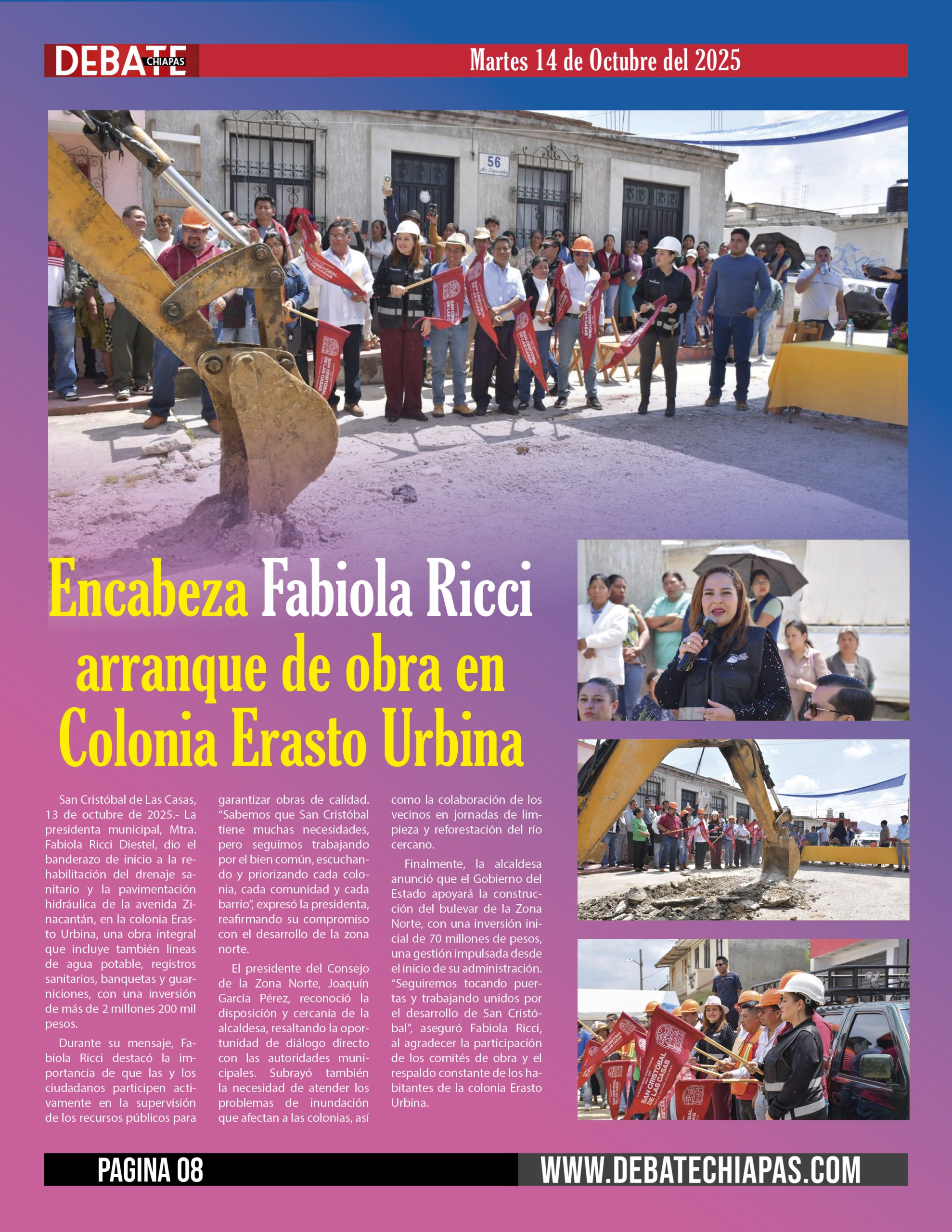 San Cristóbal de Las Casas, 13 de octubre de 2025.- La presidenta municipal, Mtra. Fabiola Ricci Diestel, dio el banderazo de inicio a la rehabilitación del drenaje sanitario y la pavimentación hidráulica de la avenida Zinacantán, en la colonia Erasto Urbina, una obra integral que incluye también líneas de agua potable, registros sanitarios, banquetas y guarniciones, con una inversión de más de 2 millones 200 mil pesos.