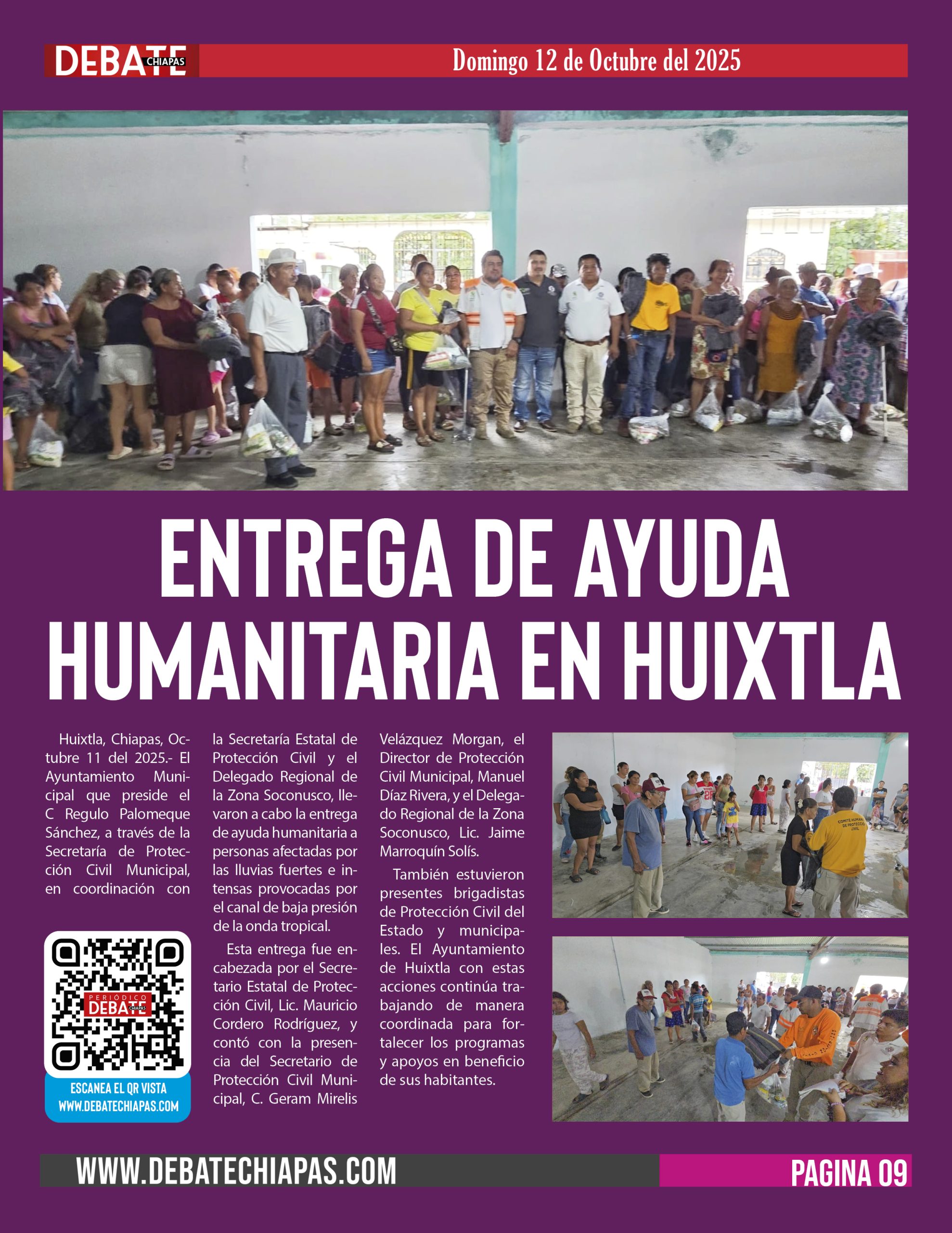 Huixtla, Chiapas, Octubre 11 del 2025.- El Ayuntamiento Municipal que preside el C Regulo Palomeque Sánchez, a través de la Secretaría de Protección Civil Municipal, en coordinación con la Secretaría Estatal de Protección Civil y el Delegado Regional de la Zona Soconusco, llevaron a cabo la entrega de ayuda humanitaria a personas afectadas por las lluvias fuertes e intensas provocadas por el canal de baja presión de la onda tropical.