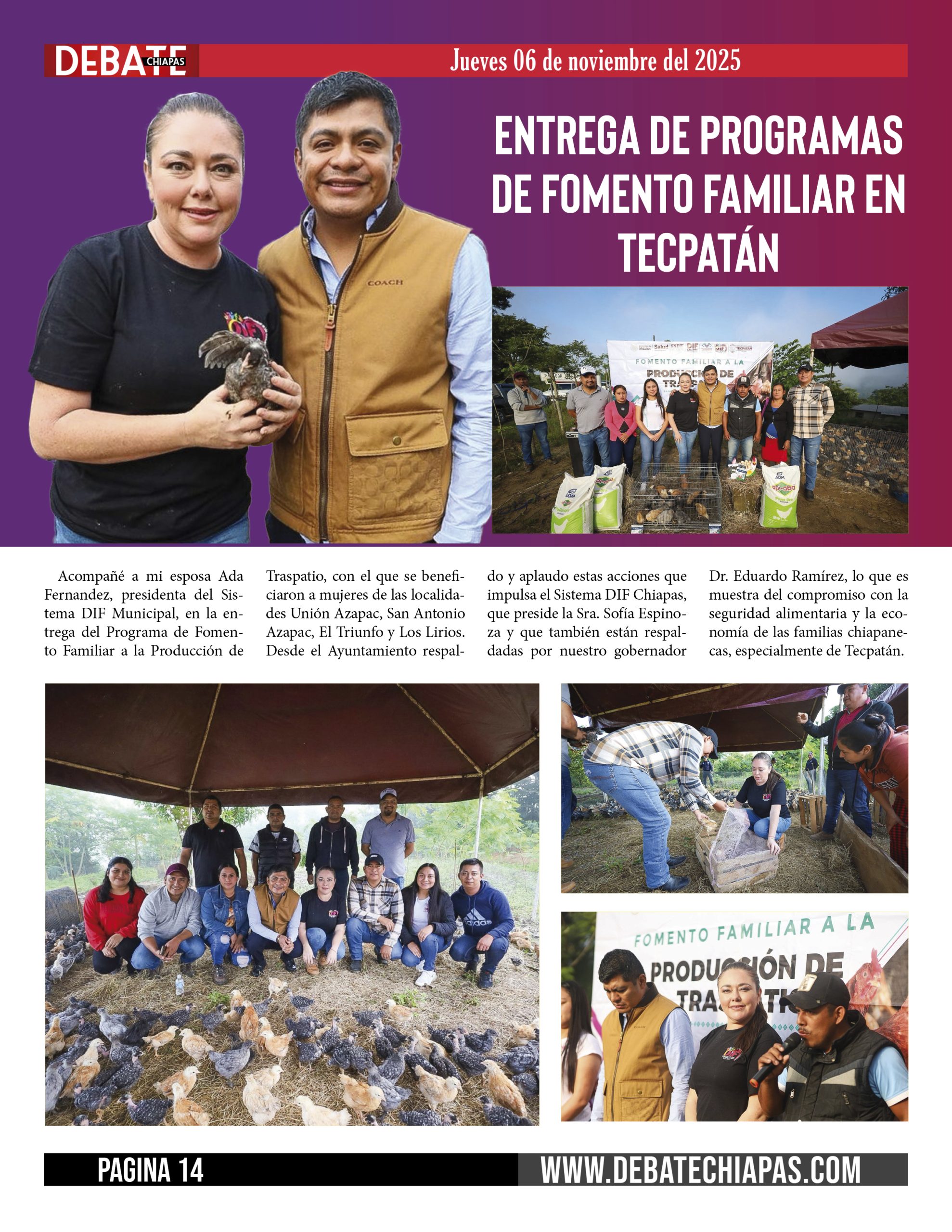 Acompañé a mi esposa Ada Fernandez, presidenta del Sistema DIF Municipal, en la entrega del Programa de Fomento Familiar a la Producción de Traspatio, con el que se beneficiaron a mujeres de las localidades Unión Azapac, San Antonio Azapac, El Triunfo y Los Lirios. Desde el Ayuntamiento respaldo y aplaudo estas acciones que impulsa el Sistema DIF Chiapas, que preside la Sra. Sofía Espinoza y que también están respaldadas por nuestro gobernador Dr. Eduardo Ramírez, lo que es muestra del compromiso con la seguridad alimentaria y la economía de las familias chiapanecas, especialmente de Tecpatán.