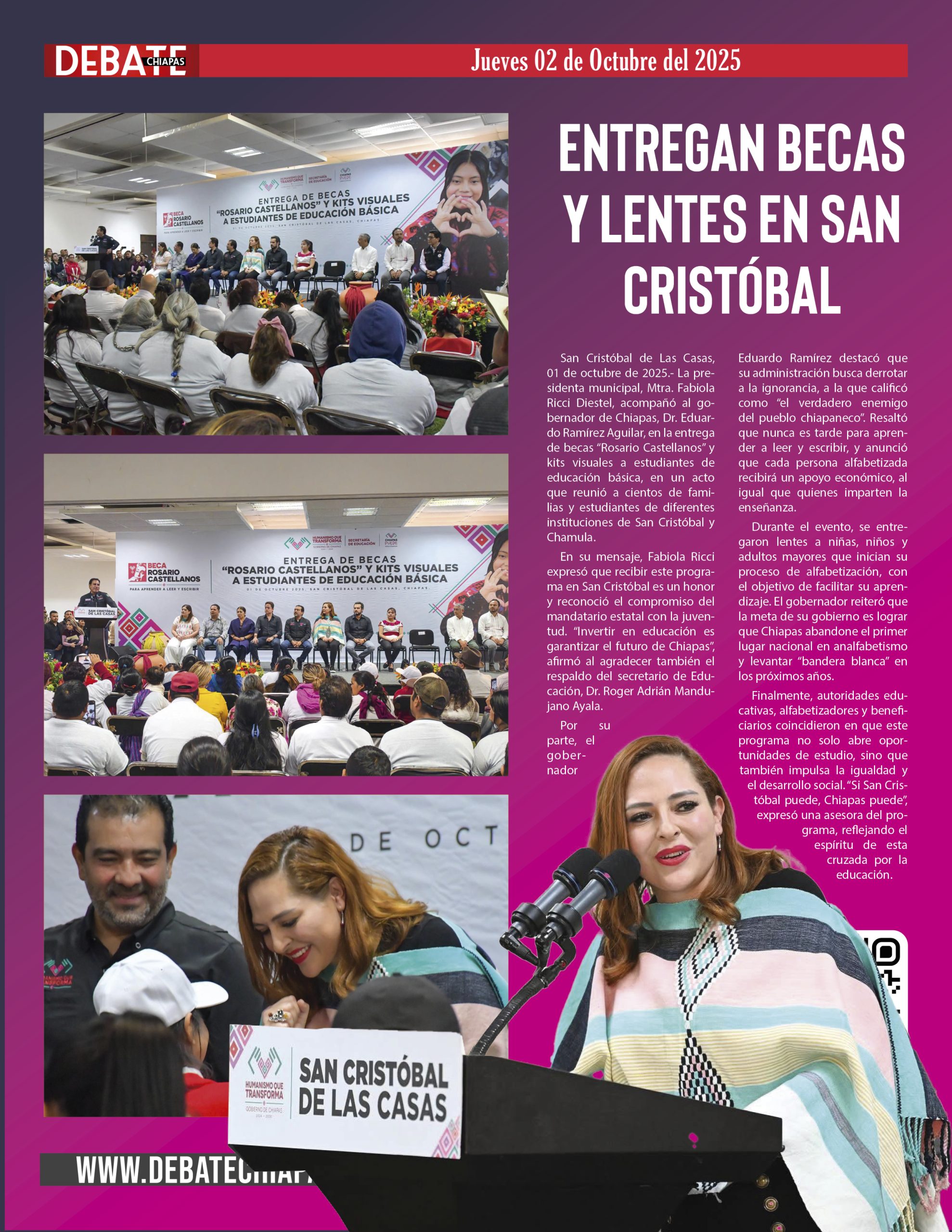 San Cristóbal de Las Casas, 01 de octubre de 2025.- La presidenta municipal, Mtra. Fabiola Ricci Diestel, acompañó al gobernador de Chiapas, Dr. Eduardo Ramírez Aguilar, en la entrega de becas “Rosario Castellanos” y kits visuales a estudiantes de educación básica, en un acto que reunió a cientos de familias y estudiantes de diferentes instituciones de San Cristóbal y Chamula.