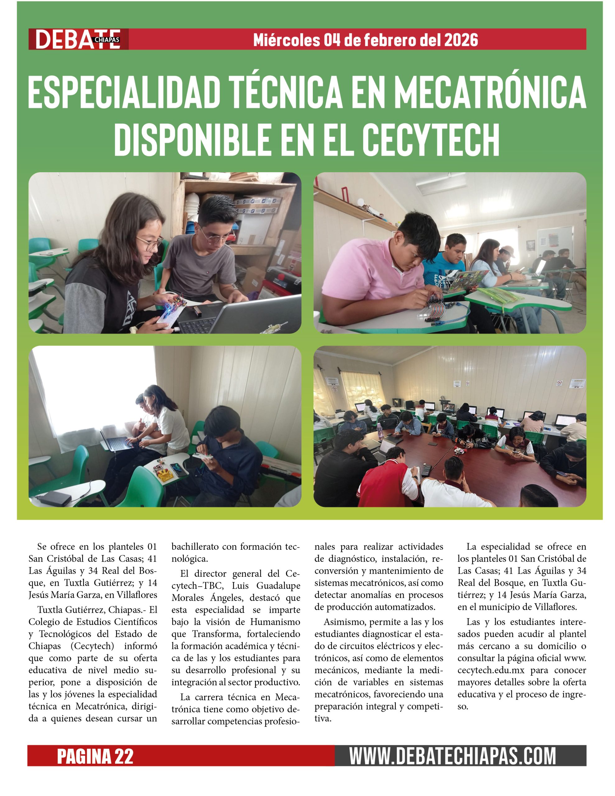 Tuxtla Gutiérrez, Chiapas.- El Colegio de Estudios Científicos y Tecnológicos del Estado de Chiapas (Cecytech) informó que como parte de su oferta educativa de nivel medio superior, pone a disposición de las y los jóvenes la especialidad técnica en Mecatrónica, dirigida a quienes desean cursar un bachillerato con formación tecnológica.